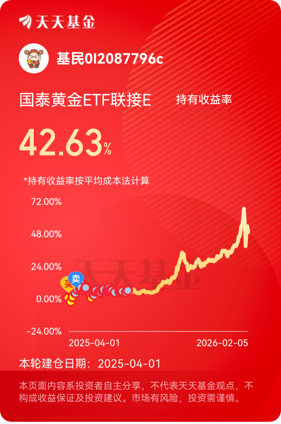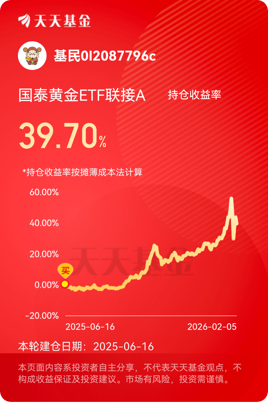 短期来看,金价受技术性回调影响可能存在震荡,国泰黄金ETF联接A的净值也会随金价出现小幅波动,但这丝毫不会动摇我的持有决心。黄金的长期上行逻辑未变,国泰黄金ETF联接A作为跟踪黄金资产的优质工具,其投资价值与长期收益潜力值得期待。未来,我将继续坚定持有国泰黄金ETF联接A,依托基金的专业运作,分享黄金行情的长期红利,让这份优质资产在我的投资组合中持续发挥价值,与广大投资者一起,在时间的复利中见证黄金投资的魅力。@国泰基金