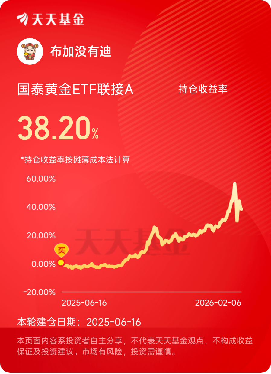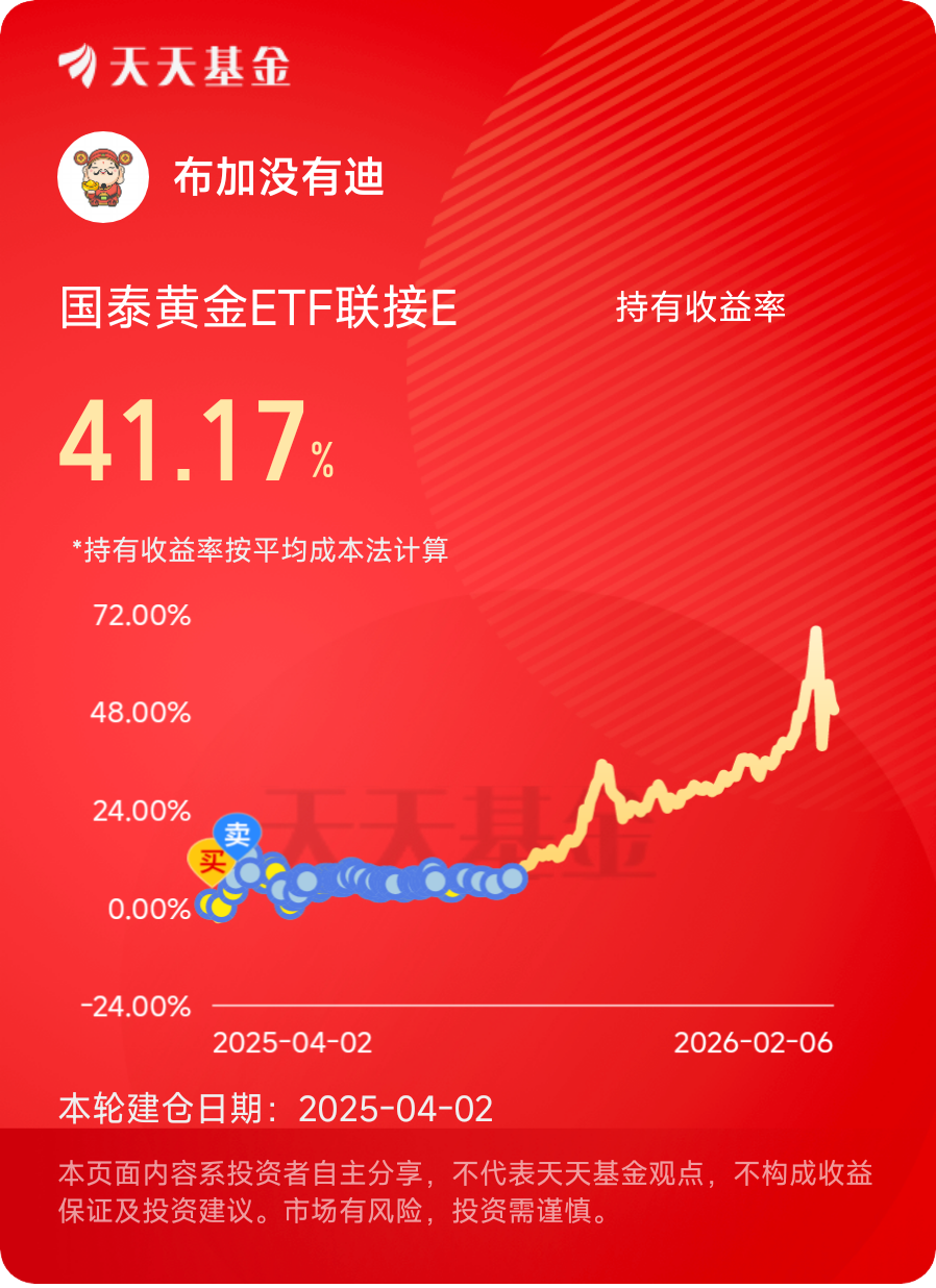 市场短期的“过山车”行情,不仅没有动摇笔者对黄金的信心,反而让笔者更加看清了优质资产的内在价值。黄金中长期上行的四大核心逻辑未改,国泰黄金ETF联接A与国泰黄金ETF联接E凭借精准的跟踪能力、优异的业绩表现与灵活的费率结构,仍是把握黄金牛市红利的核心选择。作为长期持有人,笔者将始终坚守价值投资理念,无视短期市场噪音,坚定持有并持续加仓,与基金共同成长,在黄金资产的长期上涨行情中收获更为丰厚的投资回报。在充满不确定性的市场环境中,这样的坚定配置,既是对投资逻辑的信仰,也是对优质产品的信赖。@国泰基金