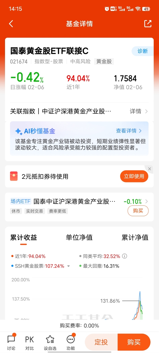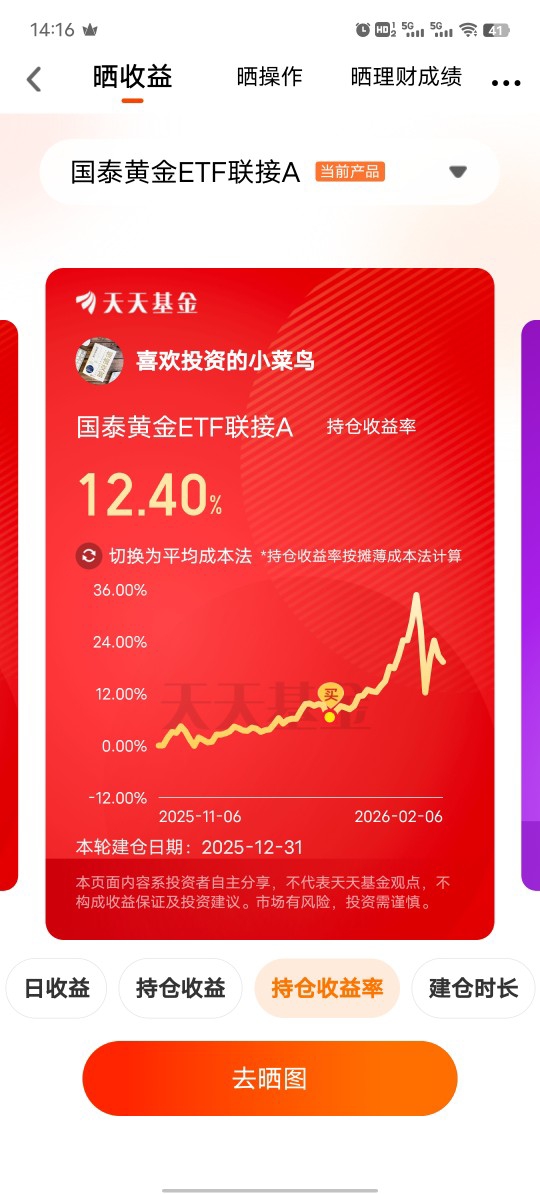 本人对于黄金资产比较关注,目前黄金价格处于上涨周期中,进入2026年以来,又是上涨,黄金做为可保值9增值的产品,一直受到人们追捧,近几年,由于国际环境影响,出于避险原因,各国央行都在不断增持黄金,造成黄金价格一路上涨。$国泰黄金ETF联接C$ 今年以来已上涨12.39%,自2017年成立至今已上涨261.10%。自2022年至今,已连续四年上涨。@国泰基金