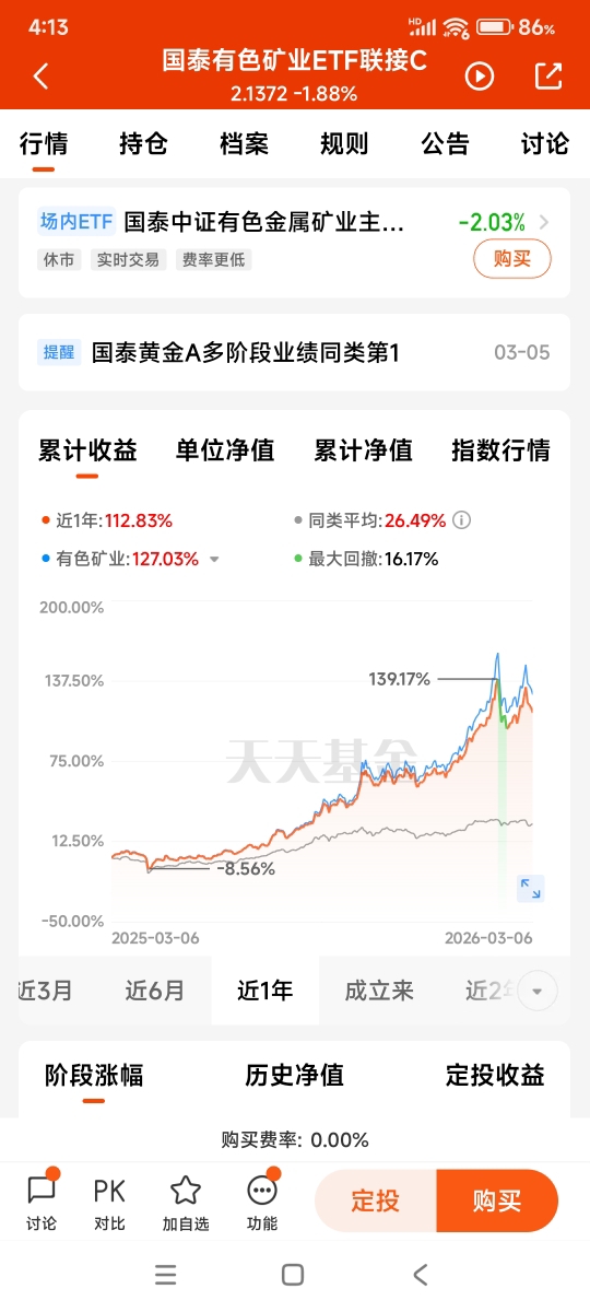 - 国泰有色矿业ETF联接C(018168):黄金+铜+稀土占比超57%