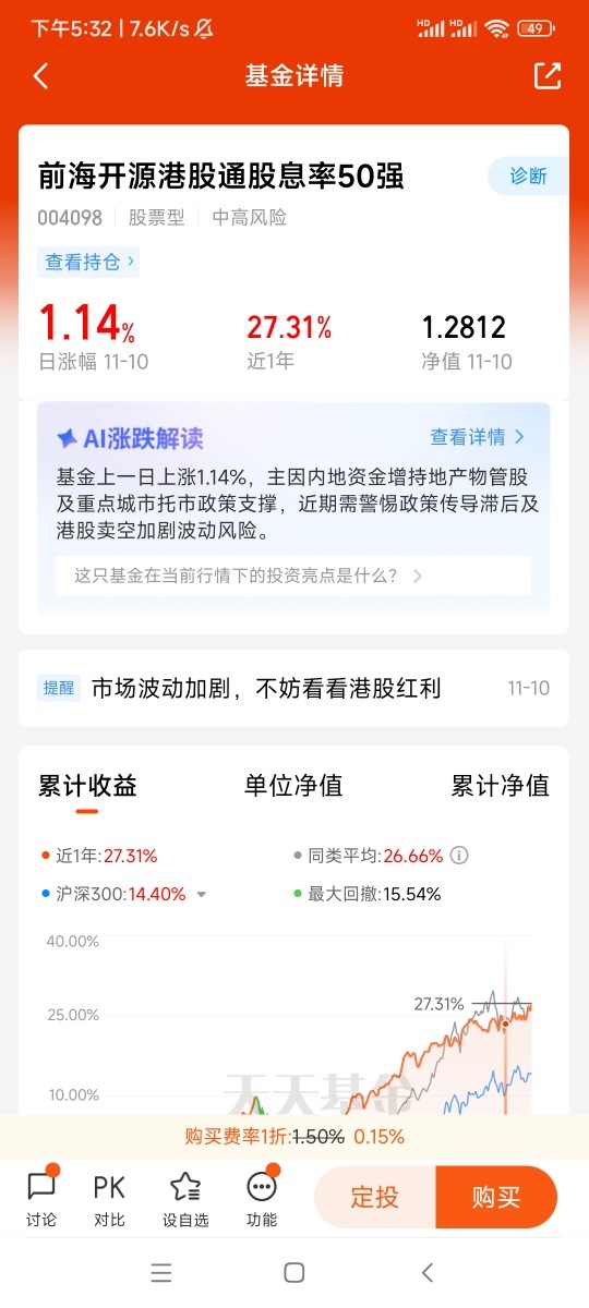 先说说大家最关心的收益表现。我持有前海开源港股通股息率50强 已有一年多时间,恰好见证了它近一年涨超26%的亮眼行情。在这段时间里,即便遇到市场阶段性调整,这只基金也展现出了极强的抗跌性,调整幅度远小于市场平均水平,而在市场反弹时,它又能快速跟上甚至超越市场涨幅。记得去年下半年港股市场经历波动时,我身边不少投资港股的朋友都亏得焦头烂额,但这只基金凭借持仓标的的高分红和低估值优势,不仅没有出现大幅亏损,反而在后续的估值修复中快速回血,最终给我带来了可观的正收益。