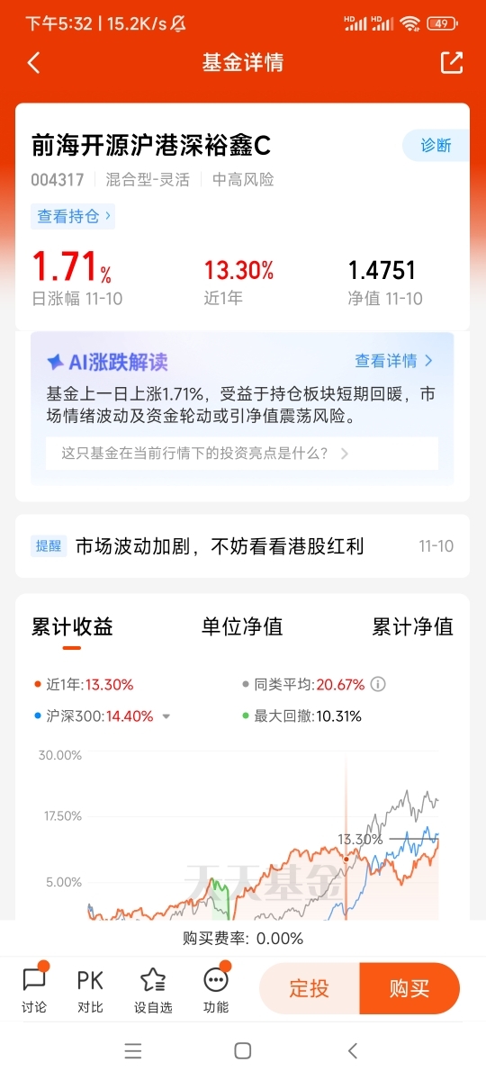 而前海开源沪港深裕鑫C 的表现同样稳健。作为一只灵活配置的混合基金,它在不同市场环境下的调仓换股能力让人印象深刻。在A股市场表现强势时,它能通过配置A股优质标的增厚收益;在港股市场估值触底时,又能加大港股持仓比例捕捉修复机会。我持有这只基金半年多来,累计收益率已经超过15%,而且收益曲线非常平滑,没有出现大起大落的情况,这种“稳稳的幸福”正是我在低利率时代最想要的投资体验。