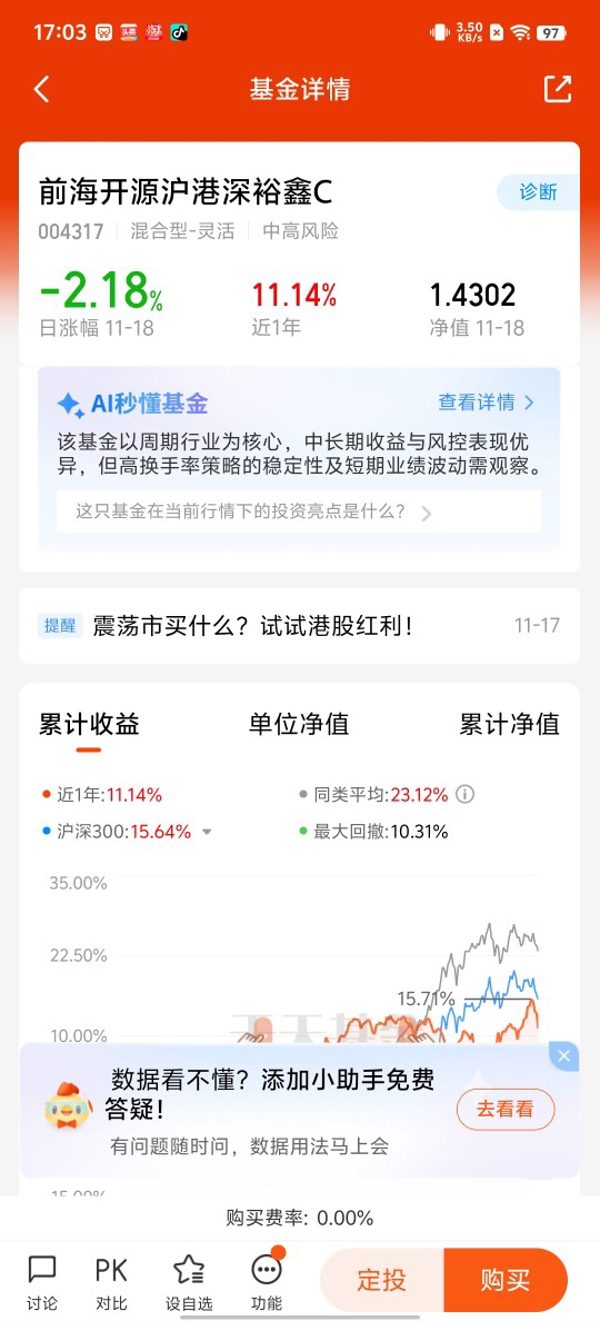 我看好$前海开源沪港深裕鑫C$,红利基金稳定性比较高,而且这只红利基金覆盖了沪港
