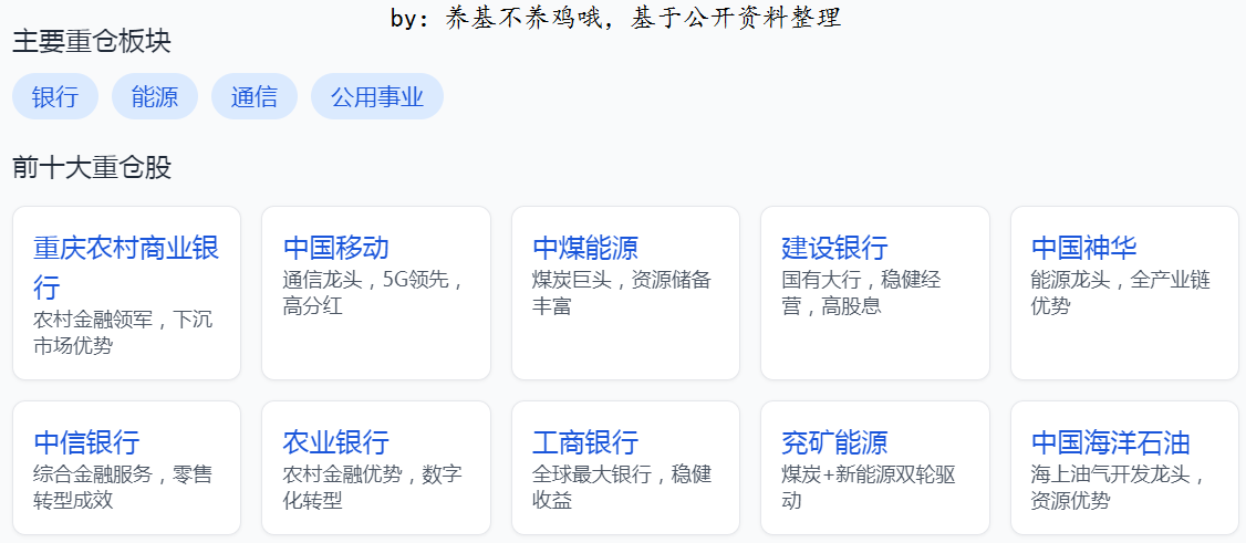 这只基金的一大亮点就是能在A股和港股两地布局,基金经理会根据两地的估值差异灵活调仓,把资金投向更具性价比的资产。目前基金的持仓以港股红利为主,正好契合我看好港股红利的投资逻辑,而且重仓的银行、能源、通信等板块,都是高股息、低波动的代表,比如中国移动、中国神华、中国海洋石油这些前十大重仓股,都是行业龙头企业,经营稳健、分红稳定,既能保证基金的抗跌性,又能带来持续的分红收益。这种跨市场配置的方式,还能有效分散风险,避免单一市场波动带来的冲击,让投资组合更稳健。