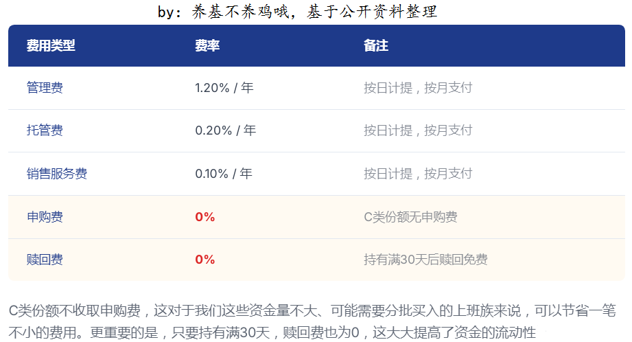 工资要用来维持生活,所以投资成本也是我特别关注的点,这只基金的费率设置可以说相当亲民。它的C类份额没有申购费,管理费率1.20%、托管费率0.20%、销售服务费率0.10%,综合费率在同类基金中处于较低水平。更重要的是,持有满30天就免赎回费,对我们来说特别灵活——如果遇到急用钱的情况,只要持有超过30天,赎回就不用额外花钱;如果长期持有,也不用承担高额的费用成本,相当于变相提升了投资收益。这种费率结构,不管是想小额定投,还是想长期持有,都特别合适,完全没有门槛压力。