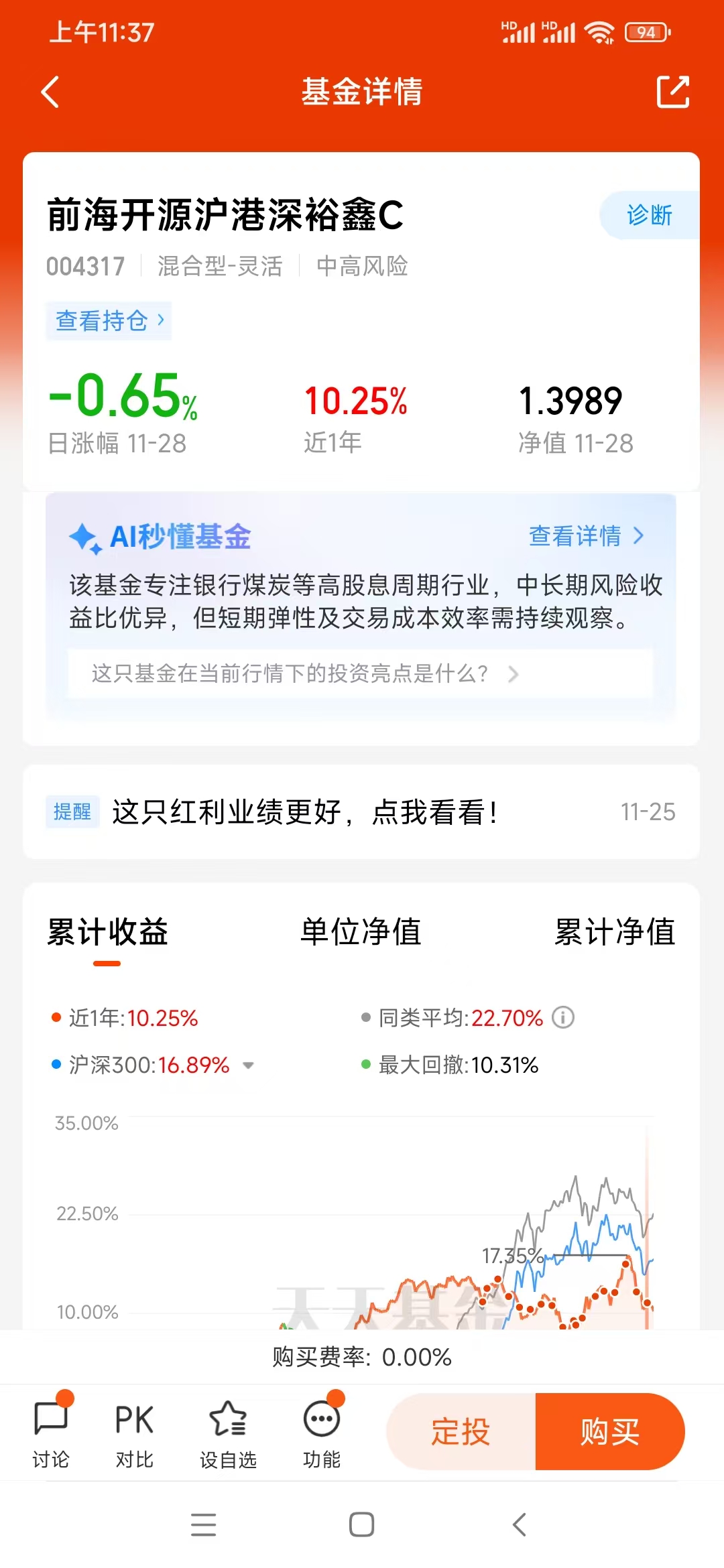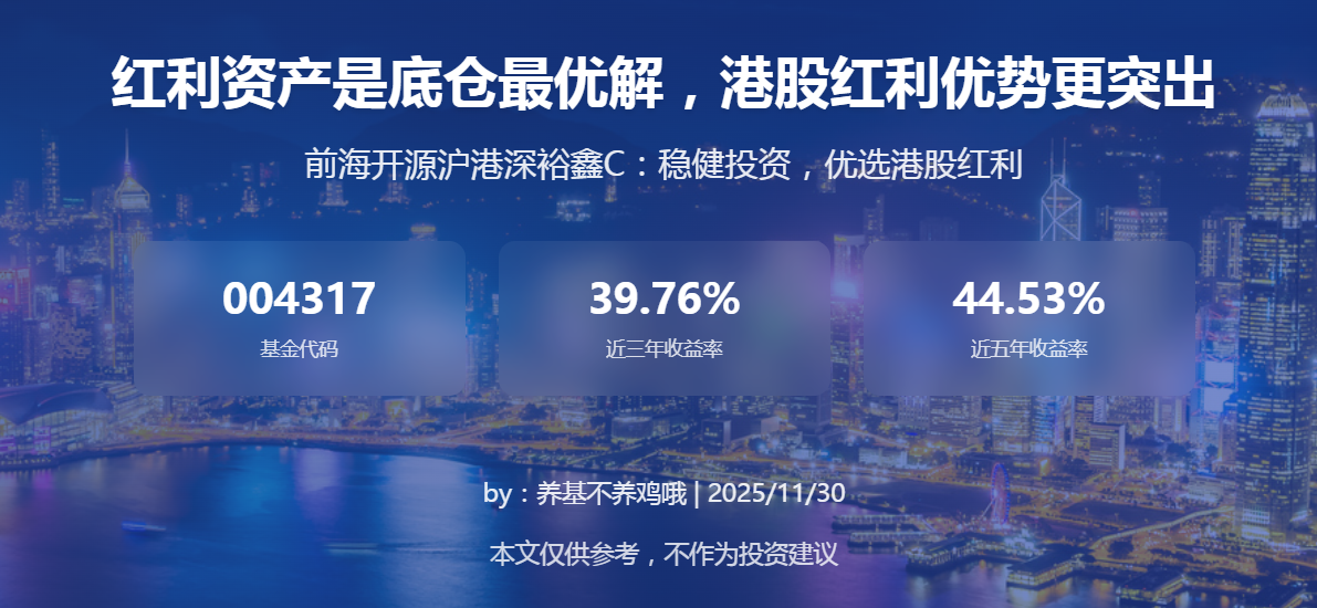 2025年快要结束了,不知道大家今年的收益如何啊?虽然我只是个上班族,但平时也没忘记投资,我投资的核心诉求很简单:不用花太多时间盯盘,波动别太大,长期能拿到稳定收益,所以基金是我的首选。在尝试过不少类型的基金后,我发现红利策略基金尤其契合需求,特别是港股红利,而前海开源沪港深裕鑫C(004317)这款产品恰恰是投资港股红利的好选择。(自选图在文末哦)