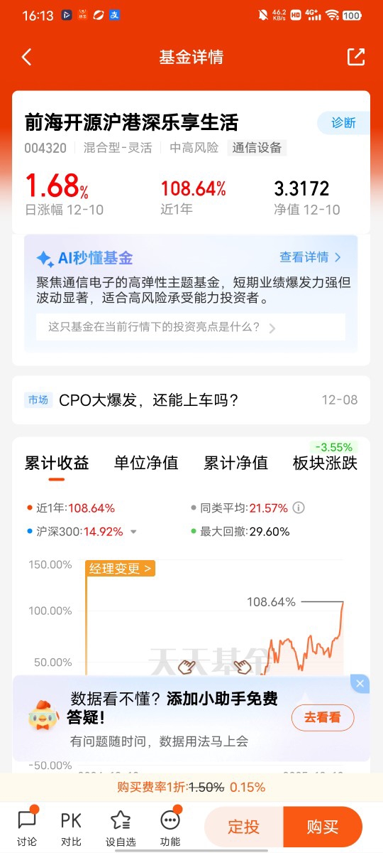后来我意识到,像我这种普通投资者,很难精准踩中CPO这种高波动赛道的节奏。于是我开始把目光放到基金上,最后选了前海开源沪港深乐享生活。