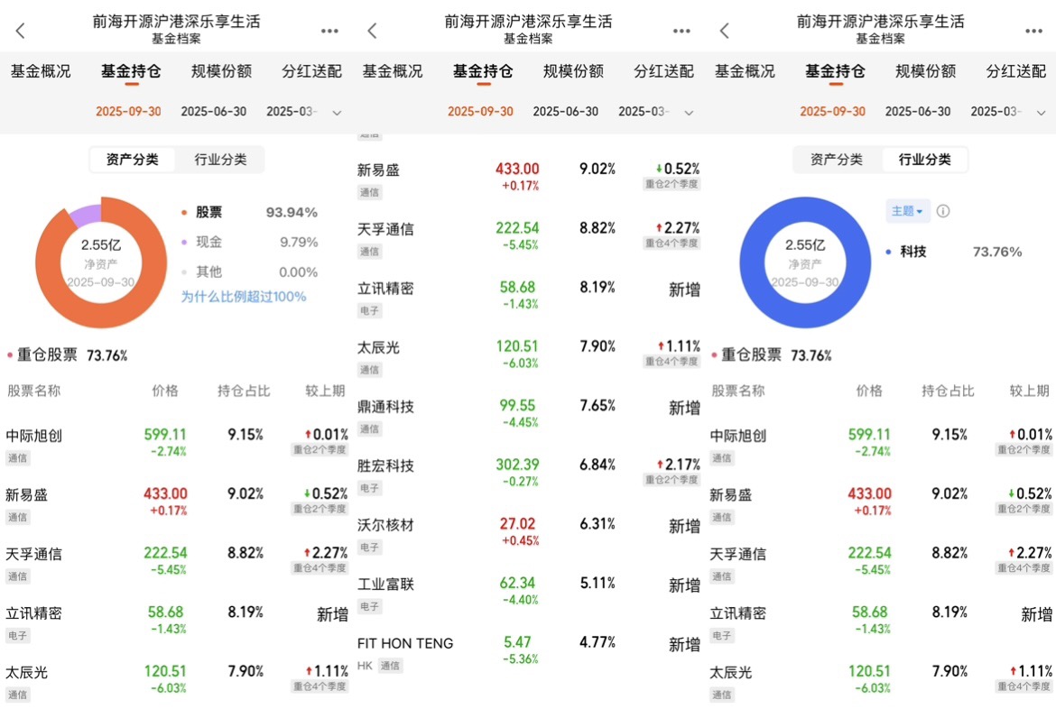 再看它的持仓逻辑,这才是我最佩服的地方,它根本不是表面上的“乐享生活”,而是精准卡了AI算力的命门。你看它前十大重仓股,中际旭创、新易盛、天孚通信全是CPO和光模块的龙头,这几个标的刚好是我之前研究CPO时圈出来的核心企业。中际旭创是1.6T光模块的全球龙头,拿到英伟达的锁价订单;新易盛的硅光封装技术是国内顶尖的,订单排期都到明年了。这些公司不是蹭热点,是真有量产能力、真有头部客户订单的,业绩能兑现,不是画饼。而且它行业集中度高,通信占了47.31%、电子26.45%,直接重仓光模块、消费电子这些AI算力的核心环节,等于把鸡蛋放在了最有潜力的篮子里,这种“精准押注”比分散投资更高效,当然前提是选对赛道,显然它选对了。
