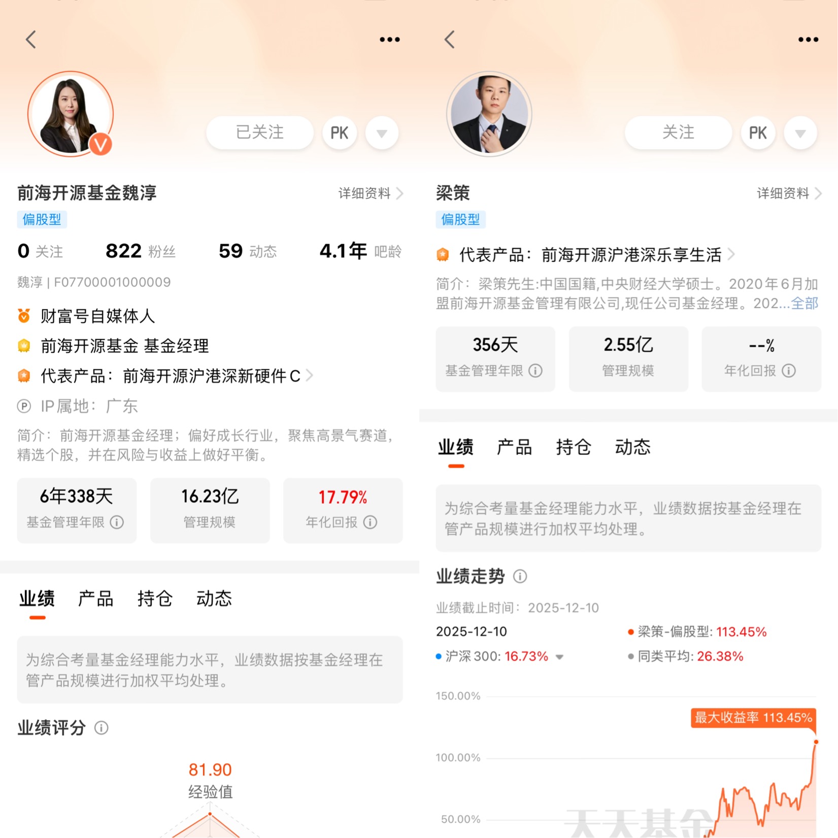 然后是基金经理,魏淳和梁策这俩人的组合我太放心了。魏淳在通信行业干了5年,从华为跳到前海开源,科技领域的研究底子特别厚,她管这只基金4年多,任职回报135.56%,年化17.79%,长期业绩摆在那儿。梁策是去年12月刚加入的,一接手就把收益拉了111.77%,这说明他能精准把握短期行情,和魏淳的长期研究能力刚好互补。你看梁策的代表作就是这只基金,近1年收益108.64%,同类排名21/2244,说明他不是靠运气,是真懂科技赛道的节奏。这种“老将打底+新人冲劲”的组合,既能稳住长期盘,又能抓短期机会,比单一经理的基金更灵活。