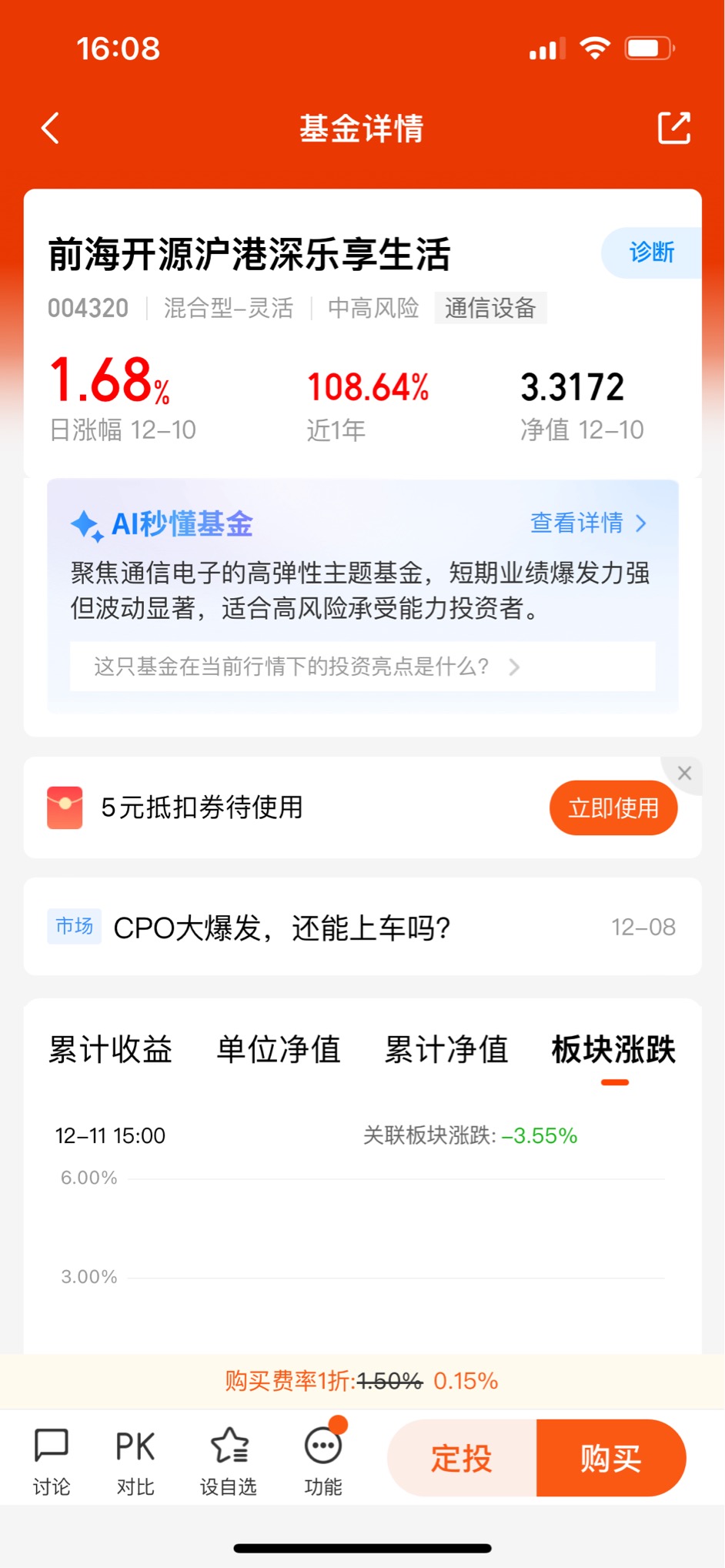 当然,风险我也不是没考虑过。它近3年最大回撤53.58%,确实波动大,但这是高弹性基金的必然代价。你看它近1年最大回撤29.6%,其实已经比之前收敛了,说明经理在控制风险。而且它的风险是“可预期的风险”,行业集中度高,要是科技赛道回调,它肯定跟着跌,但只要AI算力的逻辑不变,CPO的需求还在,它就能涨回来。我之前买过那种“莫名其妙跌”的基金,连跌的原因都找不到,这种“赚认知内的钱”的基金,反而让我更踏实。
