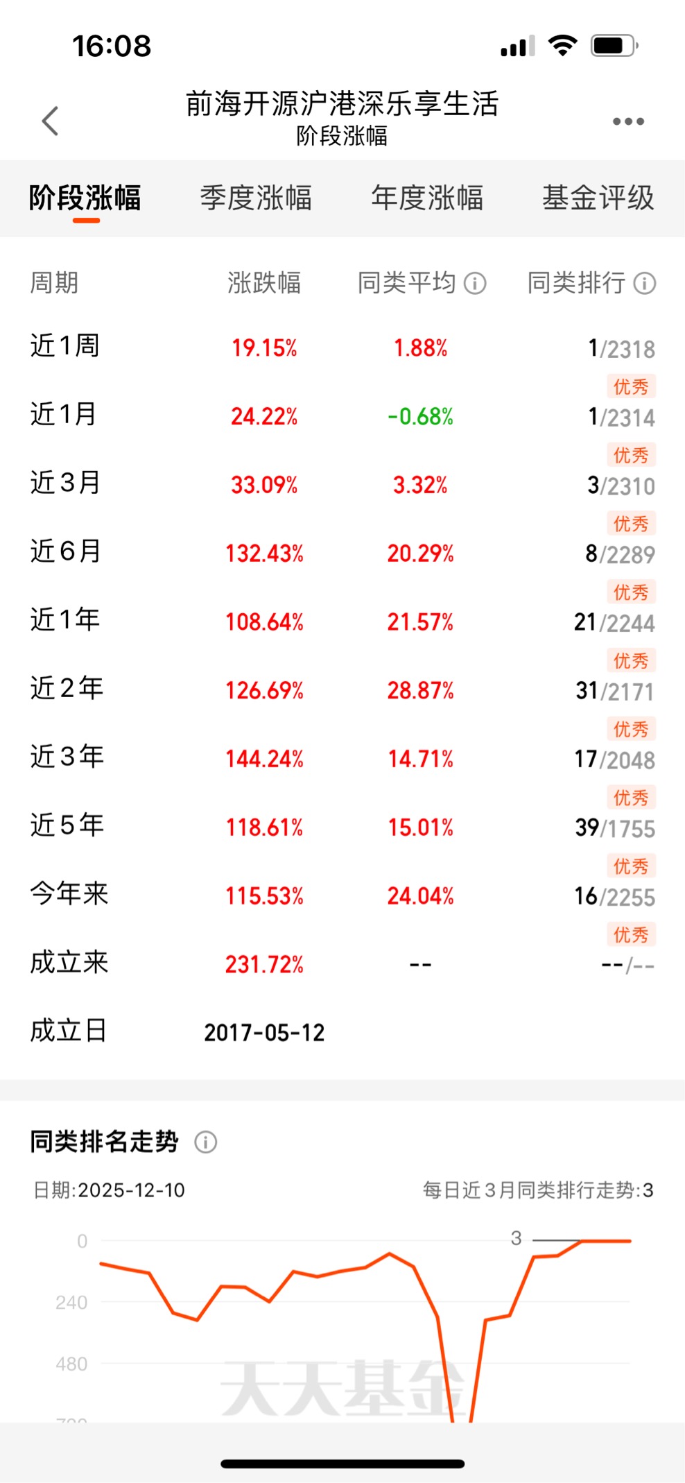 先从最直观的业绩说起吧,近一年涨了108.64%,今年来都115.53%了,同类排名常年在20名左右晃悠,这数据不是靠运气蒙的。你看它近3年累计收益144.24%,就算中间有波动,长期下来是真能打。我之前买过不少“短期妖基”,涨得快跌得更快,这只不一样,它的夏普比率近1年是2.33,说明在同样风险下,它能赚到更多收益,这才是真本事。而且你看它近1周涨19.15%、近1月24.22%,最近这波行情完全踩准了节奏,不是那种“躺平吃老本”的基金。