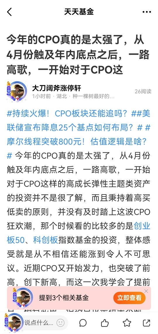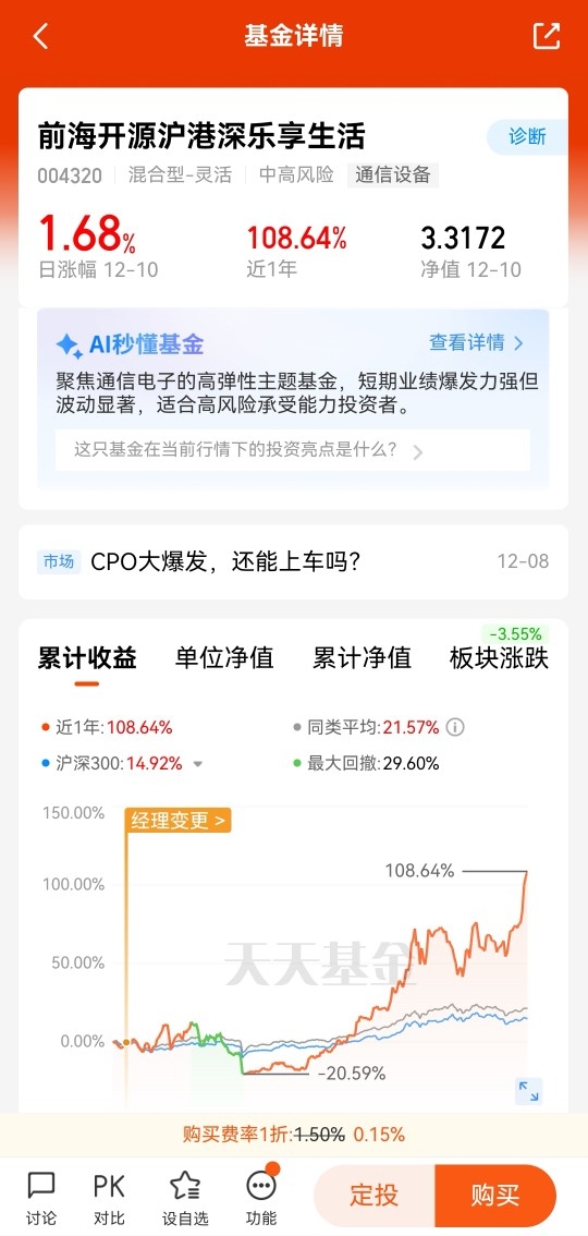 总的来说,前期我虽然没有完美匹配CPO的上涨大势,但借道创业板、科创板也算是沾上光的,近期我则是精准跟上CPO的节奏,也期待可以看到CPO继续发光发热!@前海开源基金