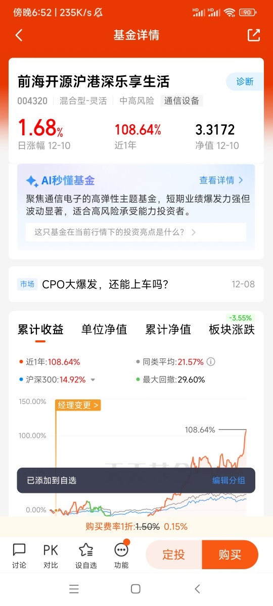 但股票投资存在着较高的波动风险,单一标的的业绩变脸或行业政策的微调,都可能导致持仓收益大幅回撤。为了分散风险,我将目光转向了基金产品,开始配置聚焦于科技赛道尤其是光通信领域的基金。在这个过程中,我深刻体会到了“专业的事交给专业的人”的道理。基金经理凭借着更全面的行业研究、更精准的个股筛选能力,能够有效规避个股踩雷风险,实现资产的稳健增值。