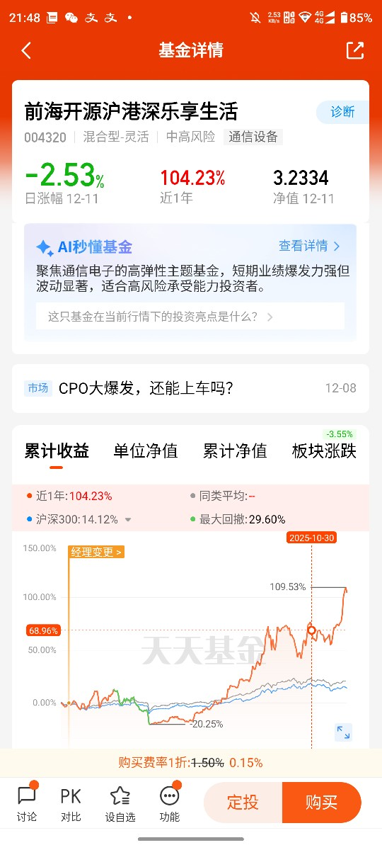 在2025年震荡的资本市场中,科技赛道分化加剧,但共封装光学(CPO)作为AI算力革命的核心基建,凭借技术突破与刚性需求双重驱动,成为少数逆势走强的优质赛道。聚焦科技成长领域的前海开源沪港深乐享生活,精准布局CPO产业链核心标的,近一年涨幅超51%,显著跑赢沪深300指数17%的同期表现,其背后正是对CPO赛道长期投资价值的深刻把握。