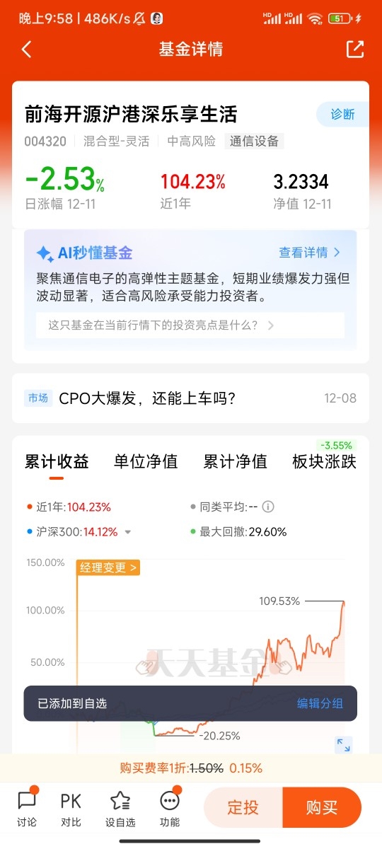 回顾我在CPO(光模块/CPO概念)这个赛道上的投资经历,如果用一个词来形容,那就是“过山车”。我的操作大致可以分为两个截然不同的阶段:第一阶段是“听消息就上”的莽撞,第二阶段是“通过基金慢慢布局”的从容。 而连接这两个阶段的转折点,正是我遇见了前海开源沪港深乐享生活这只基金。
