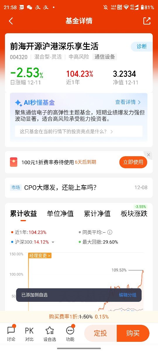 最后想给大家提个醒:热门赛道虽然赚钱效应强,但风险也高,单一个股的波动不是普通人能承受的。如果想布局CPO这种高成长赛道,像前海开源沪港深乐享生活这样的基金或许是更稳妥的选择。同时一定要记住,不要追涨杀跌,在板块回调、估值合理时布局,再加上一点耐心,才能在成长赛道里赚到属于自己的收益。投资没有捷径,但选对赛道和工具,就能少走很多弯路。