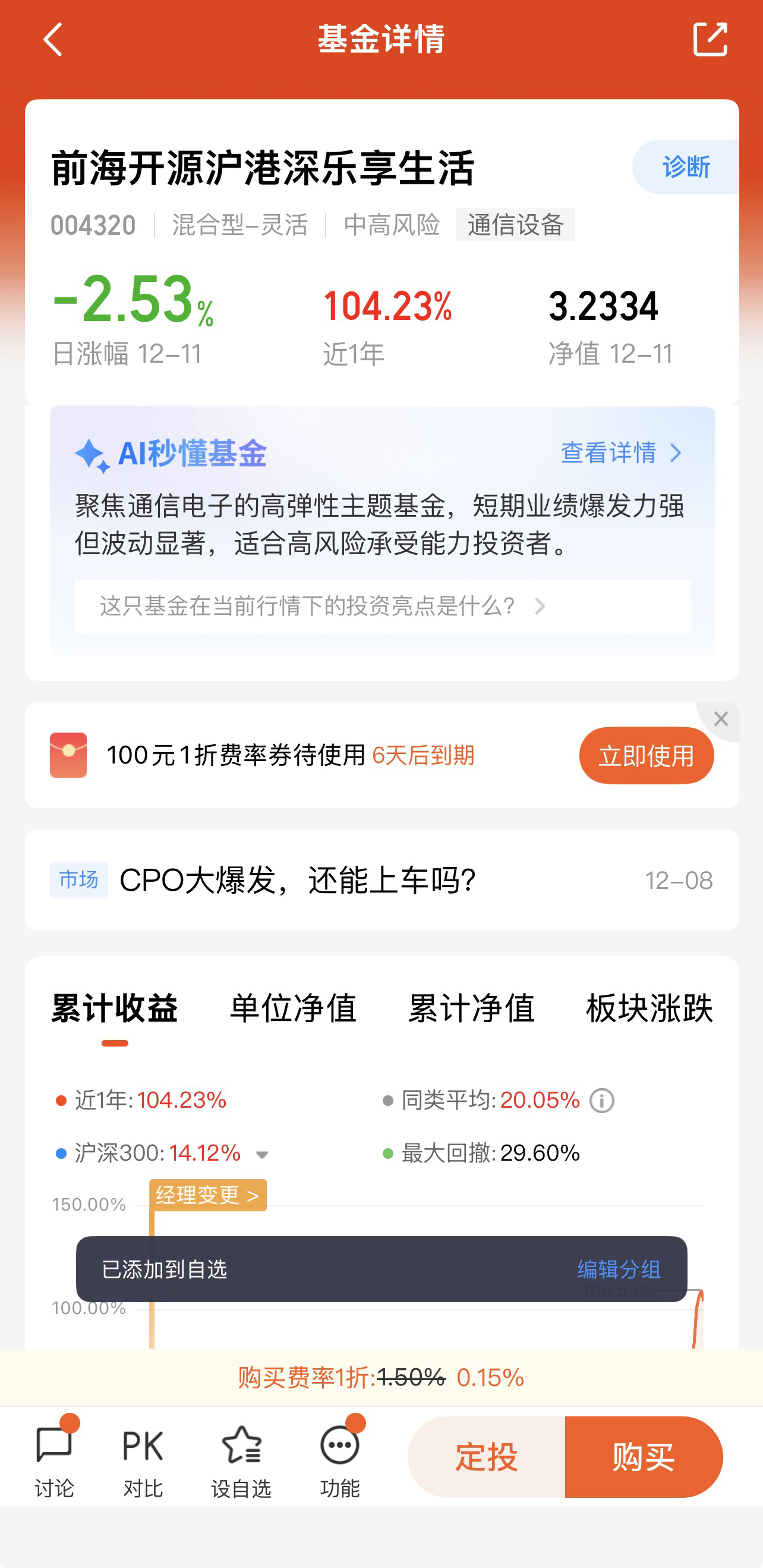 最近看CPO基金,发现这只基金还不错,来给大家分享一下:前海开源沪港深乐享生活(004320),来看看它有哪些投资优势: