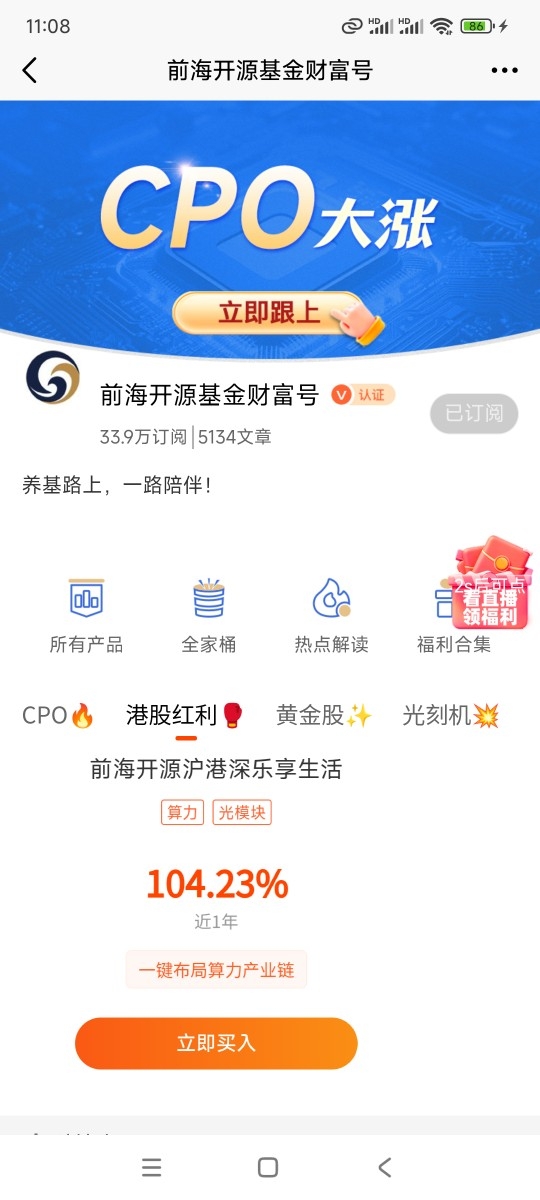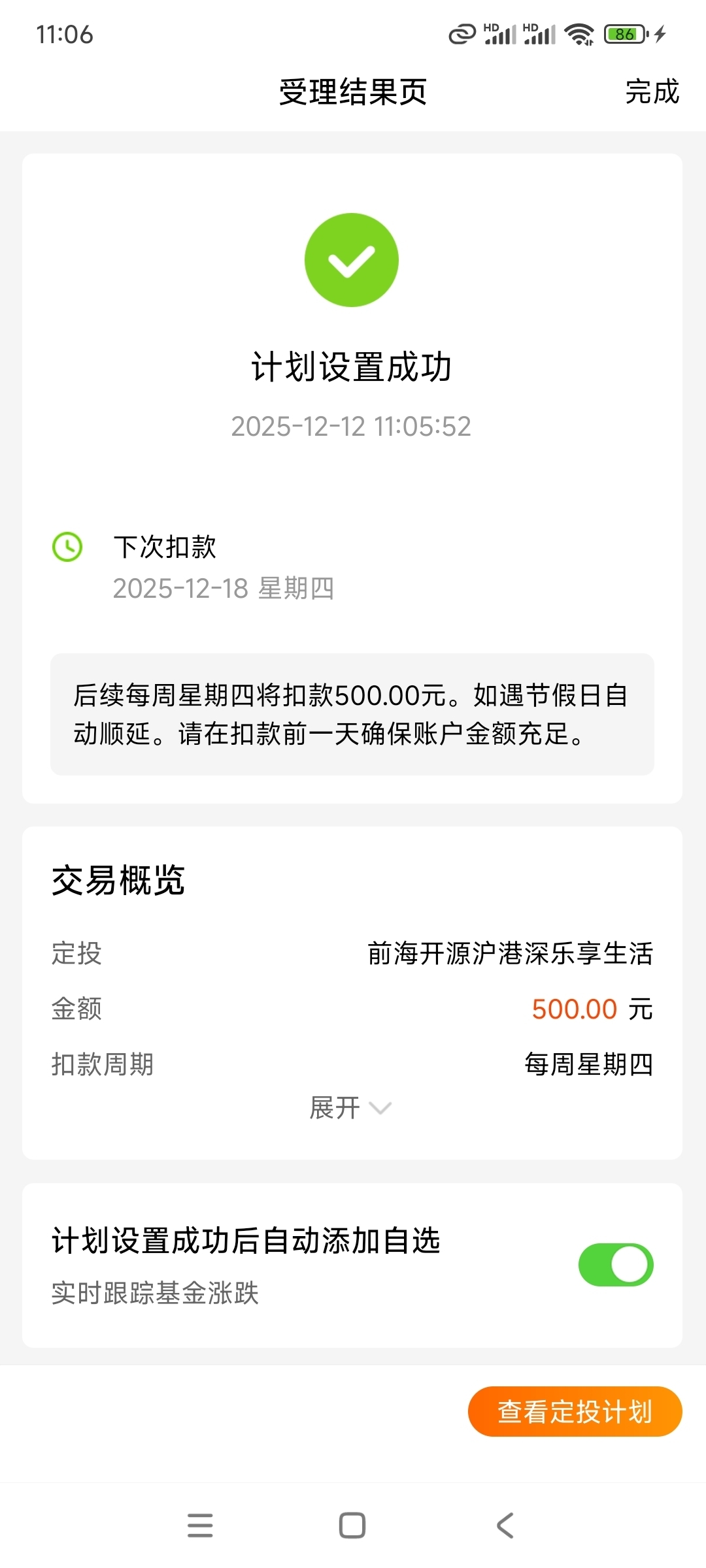 照着这个标准,我筛出了$前海开源沪港深乐享生活$ ,没想到刚买1个月,CPO板块就迎来一波暴跌,基金都跌了12%。身边一起买的朋友慌得不行,纷纷割肉离场,我却盯着基金季报:重仓股的订单都排到2026年了,1.6T光模块价格还在涨,明显是情绪性回调,不是基本面变了。于是我执行了“周定投+暴跌加仓”策略:每周四固定投500元,要是基金单日跌超3%,就额外补1000元。就这样坚持了2个月,我的持仓成本直接摊低了8%,比死扛着不动划算太多。