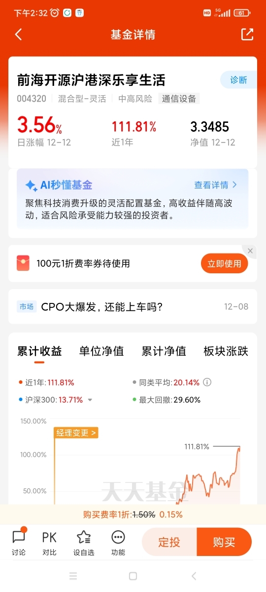 那天下午,在经过反复研究后,我终于决定买入这只重仓CPO概念的基金。之所以犹豫不决,一方面是因为这只基金近年来已经取得了不错成绩,在同类基金中排名处于前列的。另一方面,我也担心市场热点切换太快,自己会成为“接盘侠”。