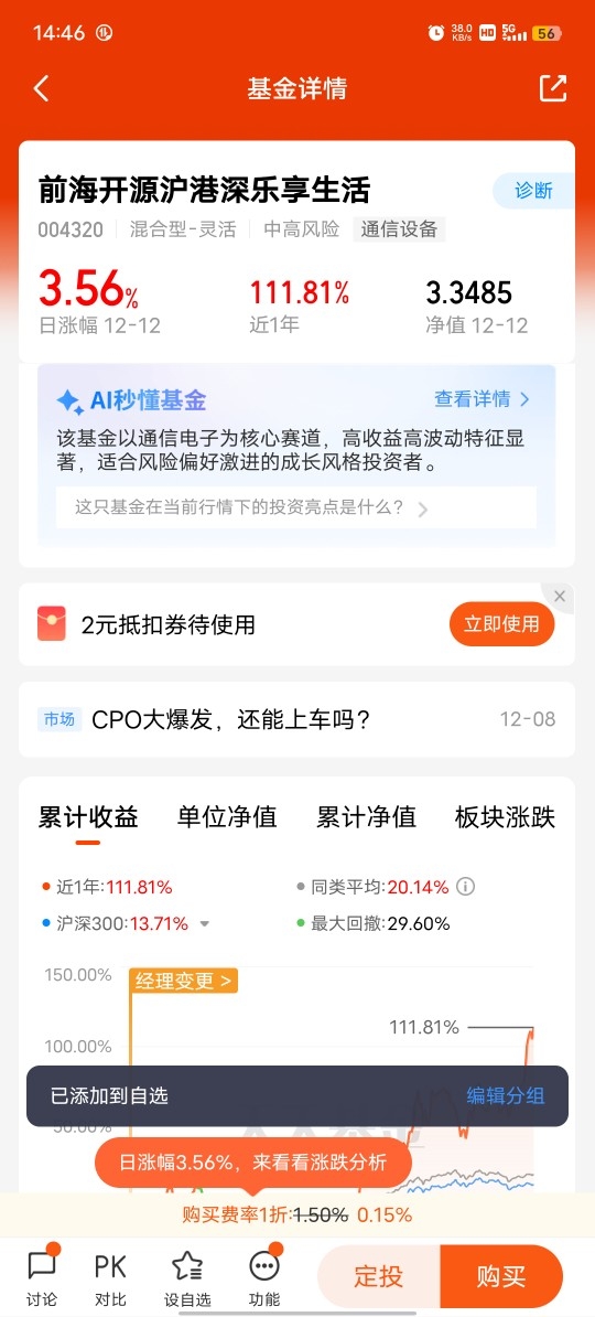 而前海开源沪港深乐享生活基金,就像我在投资路上的一个可靠伙伴。在我专注于CPO投资的同时,它也在其他领域为我创造收益,分散风险。无论是在市场行情好的时候,还是在遇到波动的时候,它都能根据不同的市场环境做出合理的调整。