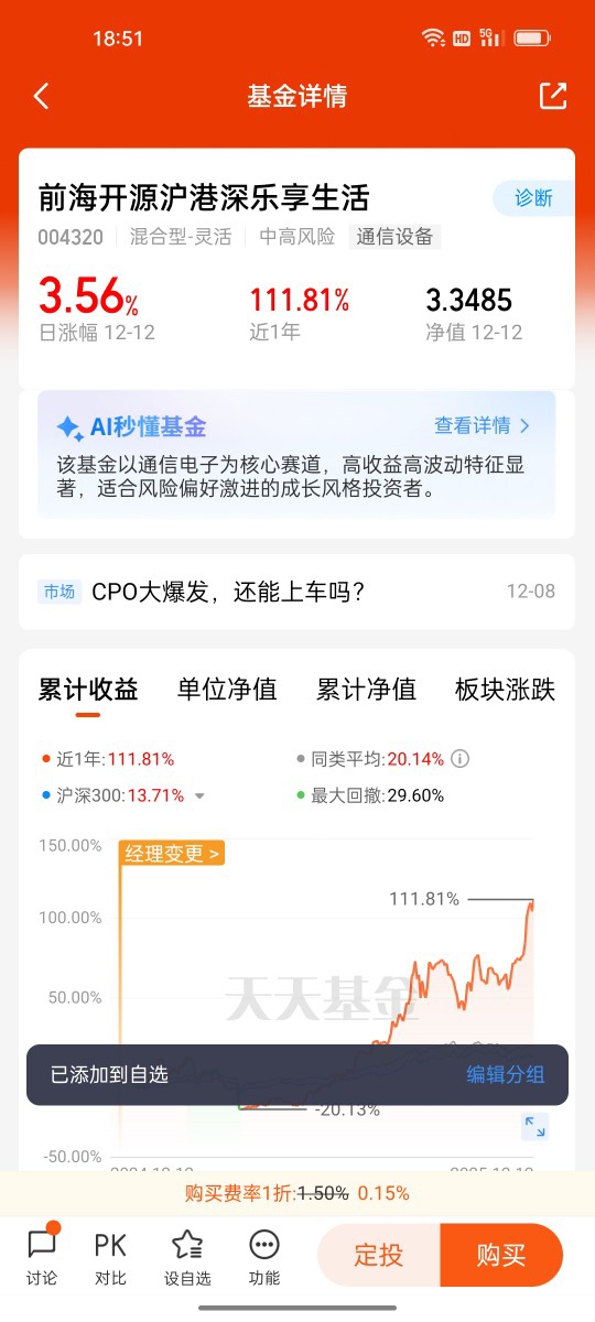 其实投资这事儿,越琢磨越明白:好赛道不等于好收益,关键是找对参与方式。CPO赛道确实是长期向好的高景气赛道,但普通人想靠自己“单打独斗”赚钱,太难了。与其冒着高风险去赌个股,不如选择一款像$前海开源沪港深乐享生活$ 这样聚焦相关赛道、投研能力扎实的基金,借助专业团队的力量,既能精准抓住行业成长的红利,又能规避个股波动的风险,相当于给自己的投资上了“双保险”。