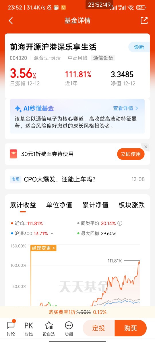 我在2025年第二季度开始重点关注CPO板块,当时正值AI算力需求爆发初期。选择前海开源沪港深乐享生活的主要原因有三:一是基金规模适中,便于灵活调仓;二是重仓股高度集中于CPO产业链,贝塔收益弹性大;三是基金经理魏淳在科技领域有丰富经验,曾通过投资茂莱光学获得165.79%的收益率。