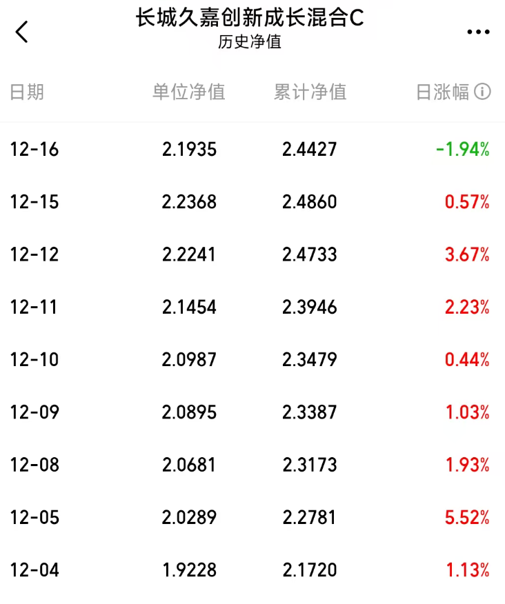 家人们,今天午后的大拉升也太给力了!长城久嘉创新成长混合C也大力反弹了,看了一下历史净值,此前已经八连涨,昨天小幅调整,今天又大力反弹,最近这只基表现不错啊,近一周+4.98%,近一个月+20.89%同类第三,这只基金投向商业航天+卫星互联网,是十五五规划的战略重点方向,在技术和产业端都具备从0到1的投资空间,有希望发展成今年初机器人的行情,一起拭目以待!