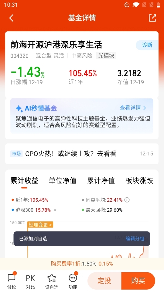 再说说具体标的。我注意到$前海开源沪港深乐享生活(OTCFUND|004320)$这只基金,它的持仓主要集中在港股和A股的科技成长型企业,其中CPO相关的光通信、半导体设备企业占比不低。从历史表现来看,近一年收益率超过45%,在同类主题基金中排名靠前。更重要的是,基金经理在三季度调仓时增加了上游材料企业的配置,这一步很关键——因为随着CPO量产推进,原材料和设备的国产替代空间更大,利润弹性可能比下游组装环节更高。另外,这只基金的规模适中,既避免了小规模基金清盘风险,又保留了灵活调仓的优势,这点在震荡市里特别重要。