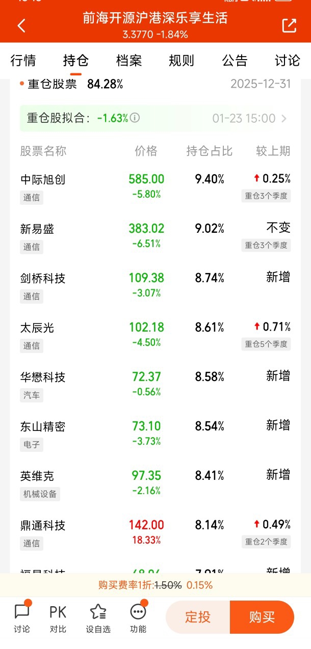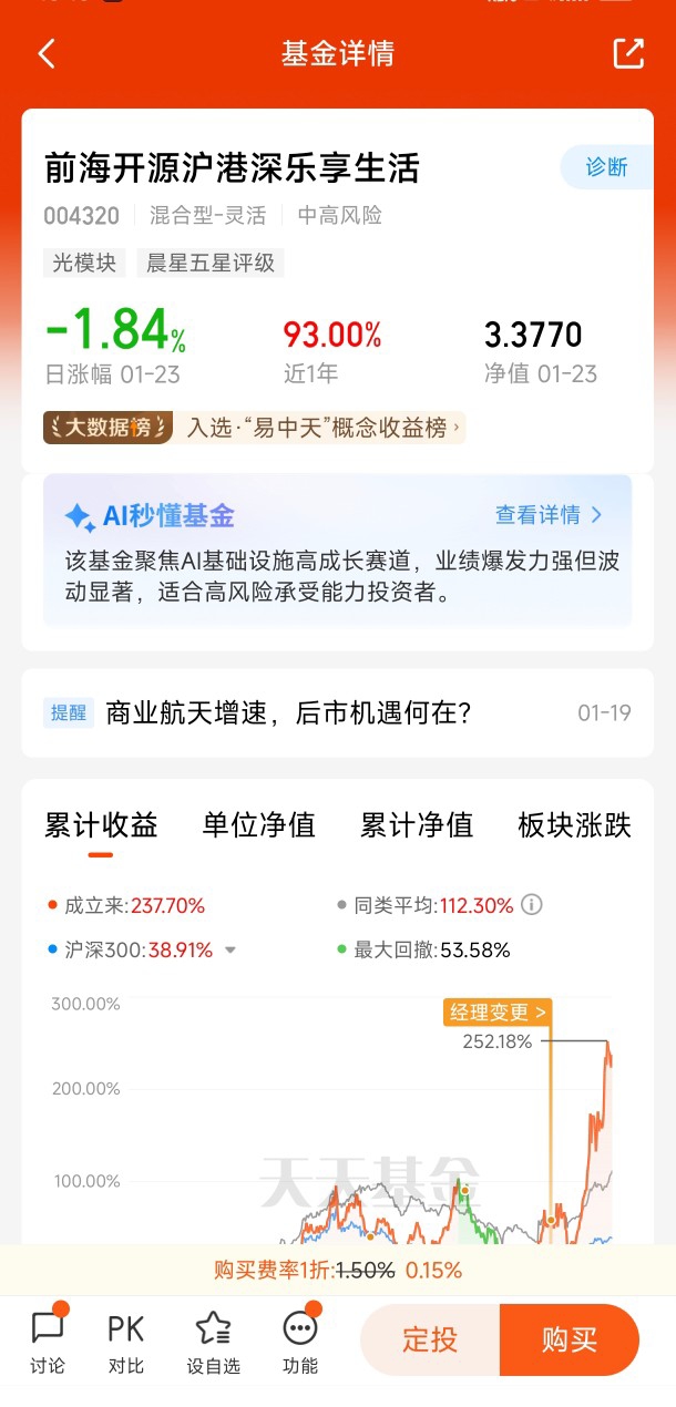 我选择的方式是通过基金参与CPO投资,而不是直接购买个股。之所以这样选择,是因为我意识到CPO涉及芯片、光学、封装、材料等多个高科技领域,选股难度大且波动剧烈,普通投资者很难把握节奏。 经过仔细比较,我最终选择了前海开源沪港深乐享生活(004320) 这只基金。