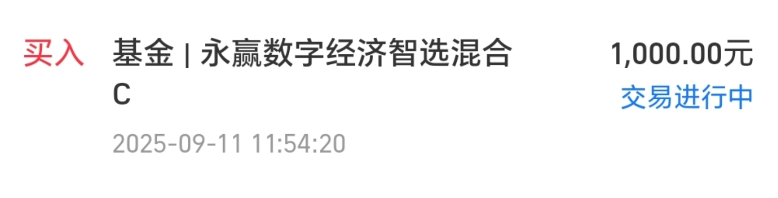 今天我买入$永赢数字经济智选混合发起C(OTCFUND|018123)$1000块钱。