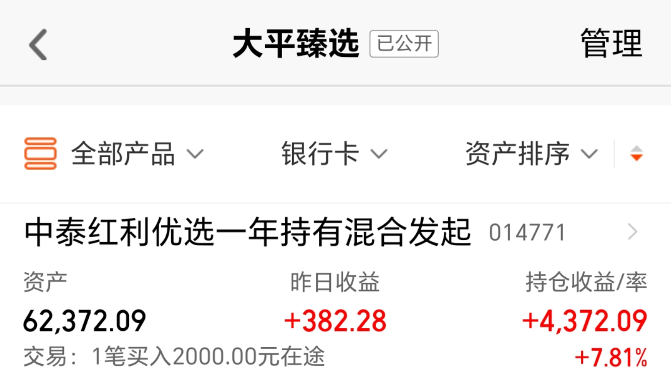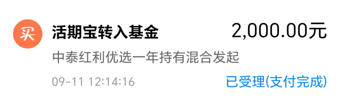 今天我买入$中泰红利优选一年持有混合发起(OTCFUND|014771)$2000块钱。