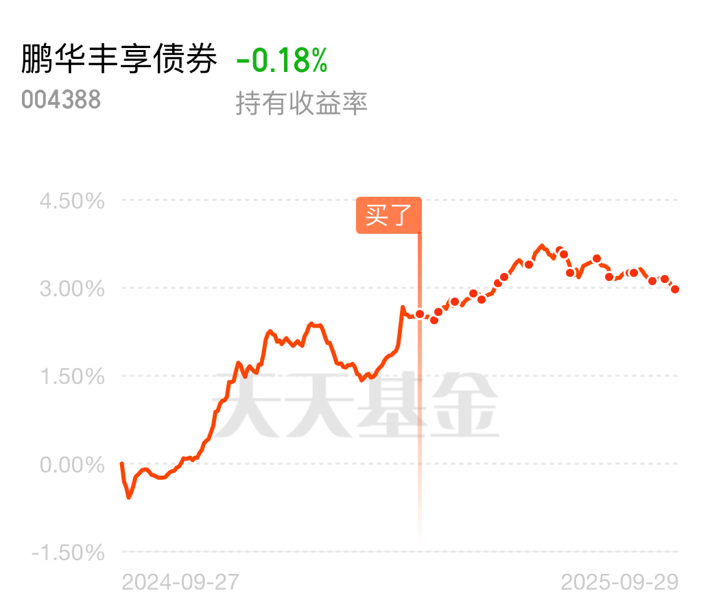 债市这是好起来了呀!今天又下了一个蛋。马上双节了,现在闲置资金买债券还是很划算的,假期有票息,还没涨跌幅,妥妥的稳赚。熙凤明天也准备再加一次仓$鹏华丰享债券$