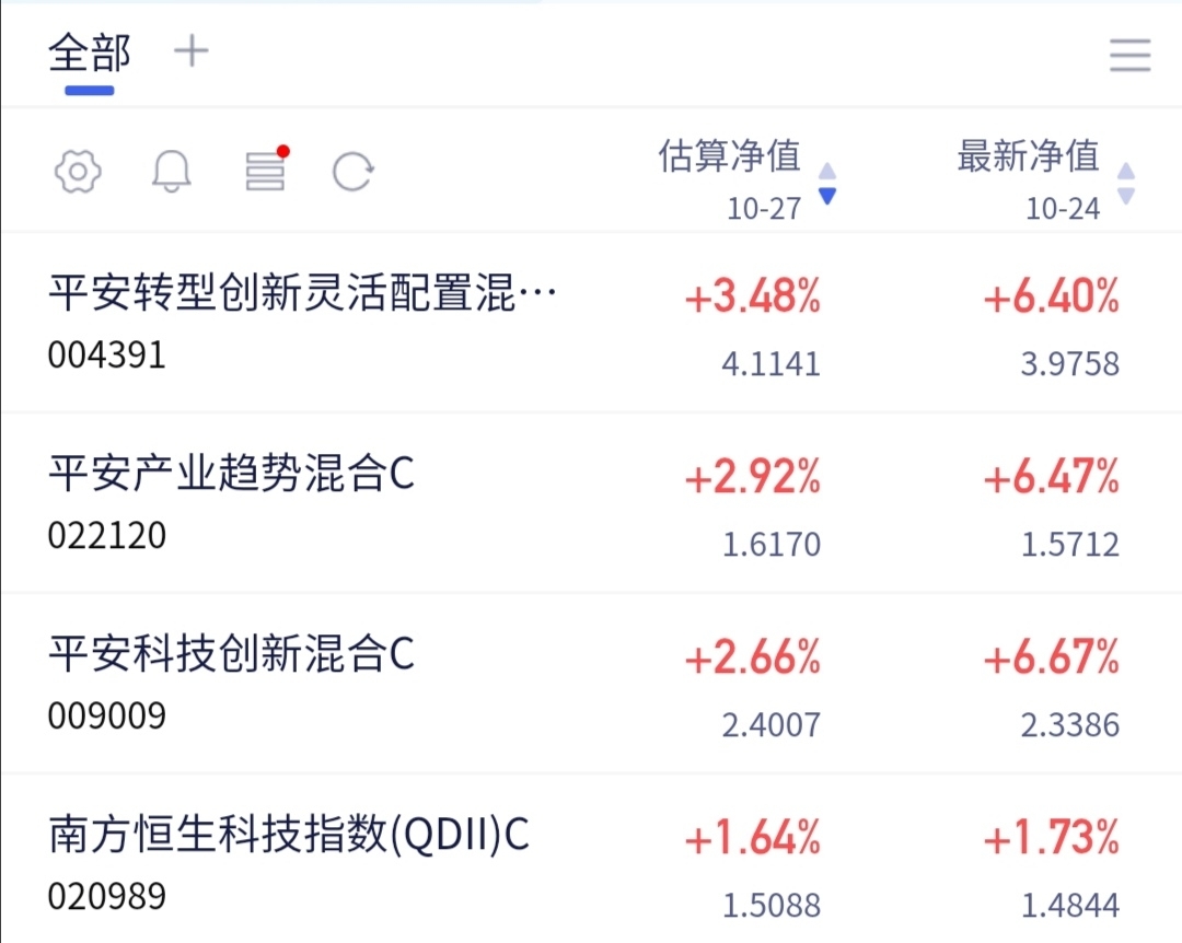 科技不愧是主线,上涨可以的。$平安转型创新混合C$ 最新估值上涨了3.48%,妥妥大肉,主要持仓科技、消费、医疗,持仓还是比较灵活的,希望继续吃肉。