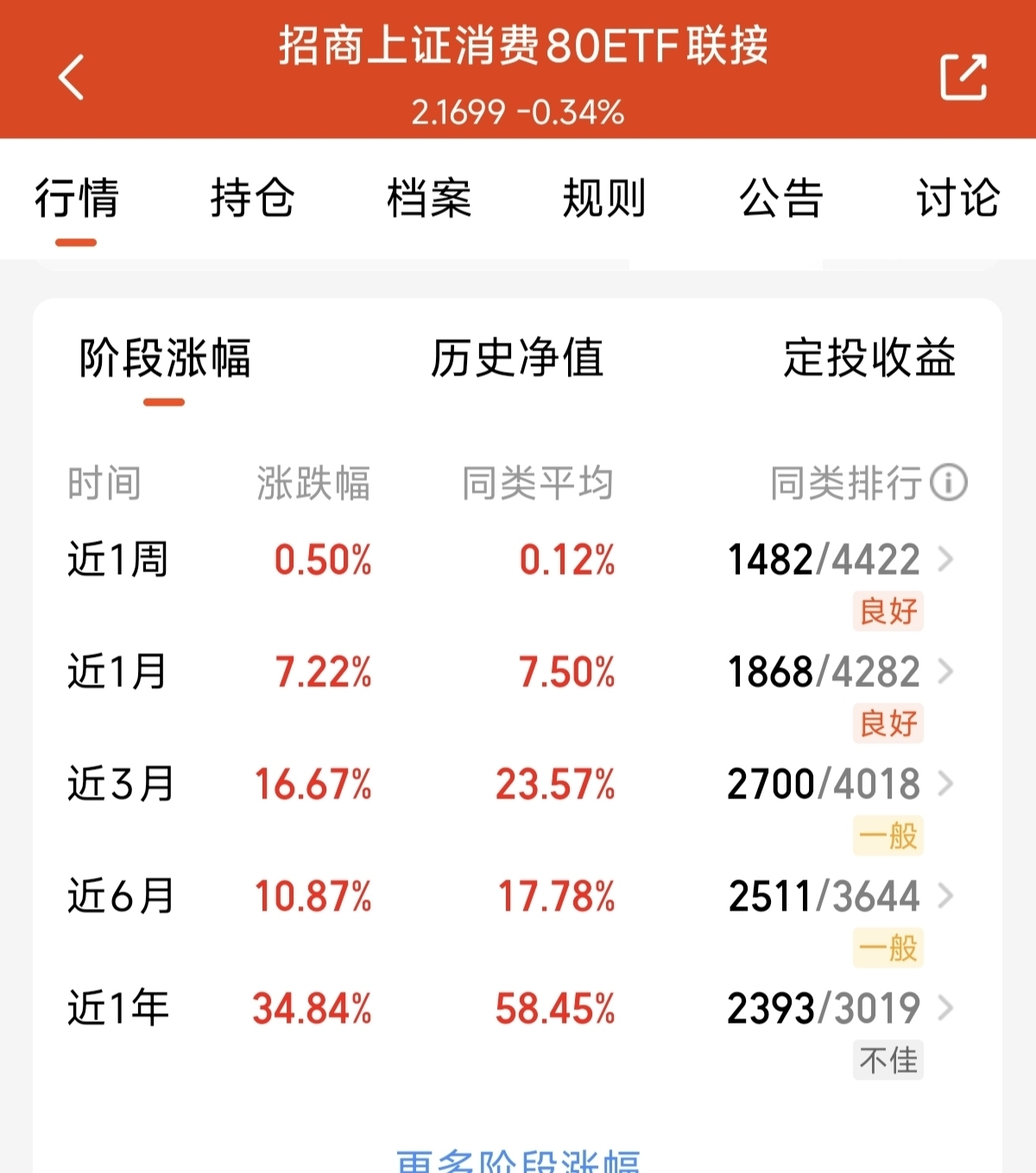 从今天早盘来看,科技还是分化比较大。而且整体位置也比较高,目前我还是关注低位的消费板块。而且马上双节临近,在节日的消费火热预期带动下,节后的消费板块有望迎来修复上涨!虽然今天的白酒等消费出现了波动,但是盘中可以看到。调整之后马上再度迎来拉伸。对比白酒的单一板块。稳定性好还是更稳的消费宽指数,$招商上证消费80ETF联接C$ 该基金跟踪的上证消费80指数涵盖了食品饮料、家电、医药等消费行业的80家龙头公司,贵州茅台、美的集团、伊利股份等,可全方位把握大消费行业的发展机会,这些优质企业,盈利的能力强,趋势面好!基金紧跟指数表现一直不错,近3月上涨了16.67%。近一年涨幅34.84%。长期稳定跑赢了指数的涨幅。而且近一年来比白酒指数涨幅要大的多。今天的稳定性同样更好。随着消费复苏,该指数的成长空间值得期待。目前估值还在低位,我继续提前埋伏,收集低位筹码。