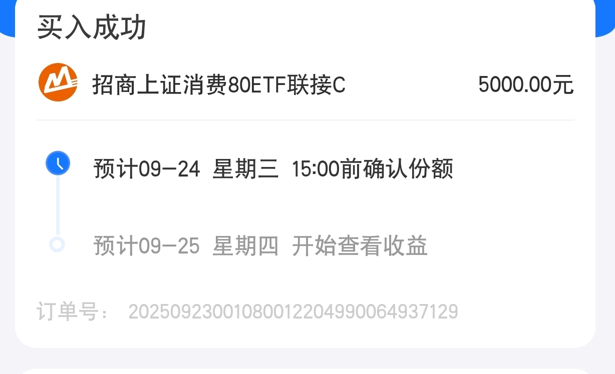 今天市场开始调整,指数一度降到3800以下,也许是即将临近假期资金出逃,不过我还是看好即将到来的国庆和中秋双节,消费能有一波行情,所以今天布局这只$招商上证消费80ETF联接C$ ,这支紧密跟踪上证消费80指数,一键网罗贵州茅台、中国中免、恒瑞医药、伊利股份等消费领域80家优质上市公司,覆盖白酒、医药、家电、零售等高景气赛道。而且现在Z策面也在不断促进消费,所以这里潜力还是很足的。再看看业绩,近3个月涨了15.72%。近6个月涨了13.18%,近一年涨了34.94%,整体位置不高,慢慢布局起来了,期待后市表现。