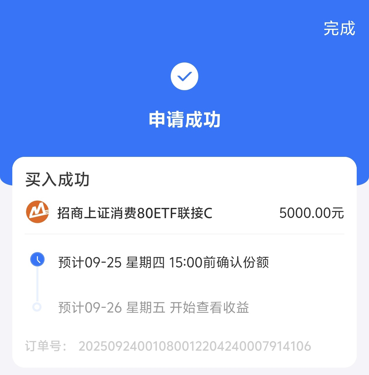 $招商上证消费80ETF联接C$ +5000元,基金到目前为止估值上涨了0.31%,今晚吃肉。基金表现的也是非常的优秀,近三个月上涨了14.93%,近一年的收益率高达33.4%,收益率高。各阶段业绩在同类基金排名领先,基金精准的跟踪消费80指数,上涨弹性大,爆发力强。 政策利好,明确提出扩大内需,发放消费券等刺激消费政策。基金选取沪市中规模大、流动性好的80只作为股票作为指数样本,成分股中包含了贵州茅台、恒瑞医药、伊利股份等细分行业龙头,在行业中拥有强大的竞争优势,公司稳定盈利。随着市场行情的回暖,将迎来新一轮的上涨。长期持有,投资性价比高,期待后期收益!