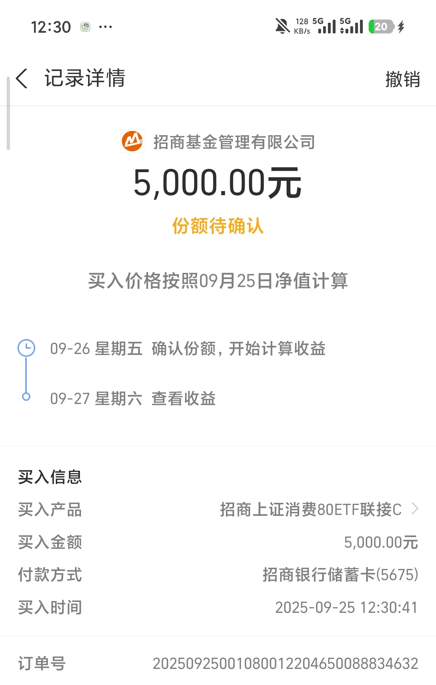 昨天大反攻之后,今天A股震荡,三大指数分化,消费开始稳步上涨,资金博弈双节消费,以及10月可能的万亿消费政策,而消费本身之前就是滞涨,处于低估值状态,不像科技泡沫大,消费旺季也要来临,所以今天继续+5k的$招商上证消费80ETF联接C$ ,