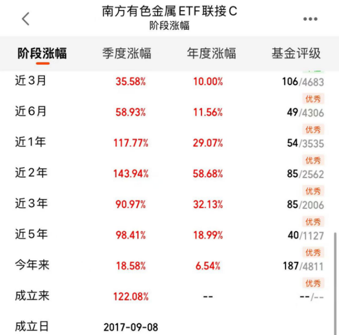 比如,你可以关注南方中证申万有色金属ETF发起联接C(基金代码:004433)。它的好处很明显。首先,覆盖面够广。不管你是看好传统的铜、铝,还是新能源相关的锂、钴、稀土,或者是黄金、白银这些贵金属,这个基金打包了申万有色金属指数里的50家龙头公司,自然就分散了单一品种或单个公司的风险。其次,这些成分股里,很多都是国内乃至全球的行业巨头,拥有资源优势和定价话语权,能更好地分享全球宏观变化和行业上涨的红利。最后,门槛低,不用开股票账户,在基金销售平台就能买,很适合普通人参与。从业绩上看,它的表现也相当能打。近三个月涨幅超过35%,近半年接近60%,近一年直接翻倍有余,近两年累积收益接近1.5倍。自成立以来总回报超过了120%,即便采用近三年定投的方式,收益也实现了翻倍。这背后反映的,正是过去几年有色金属板块的整体强势。$南方有色金属ETF联接C(OTCFUND|004433)$