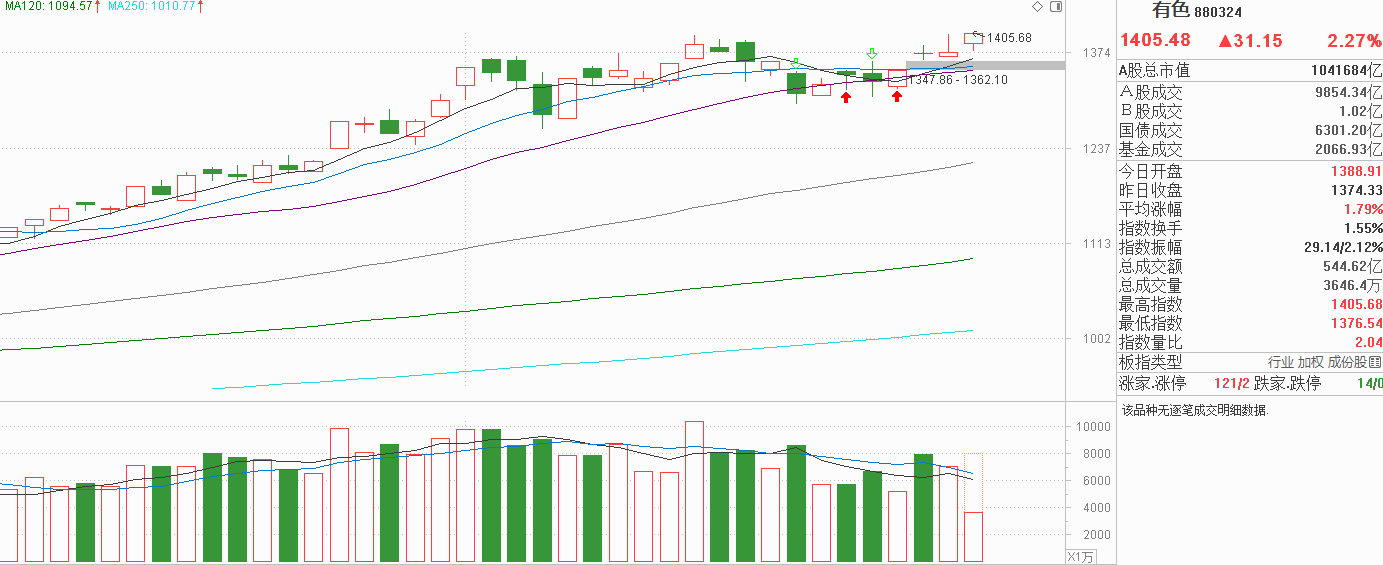 家人们,咱们的目光锁定有色金属!上周五小阳反弹创新高后回落收出一根带上影线的阳线,如果是震荡市的话,我认为上影线就是抛压所在,今天向下探找支撑才是正常表现。今天有色金属并没有这样走,而是受利好消息影响再度高开震荡,情况与上周四表现一致,我认为已经不属于震荡市的表现了。基于今天有色金属继续上行,我认为上周五有色金属创新高是有效的,回落是短线获利盘在节前考虑落袋为安而已,只要利好消息走够多,这些短线离场的资金抛压只会越来越少,继续上行的概率更大一些。此外,目前有色金属均线是粘合的,5天线刚刚拐头向上,真出现回落均线粘合对有色金属还是支撑,甚至是比较好的低位潜伏机会。在这么多利好加持,我认为有色金属再回到9月18号低点已经不可能了,还是顺势而为好了。