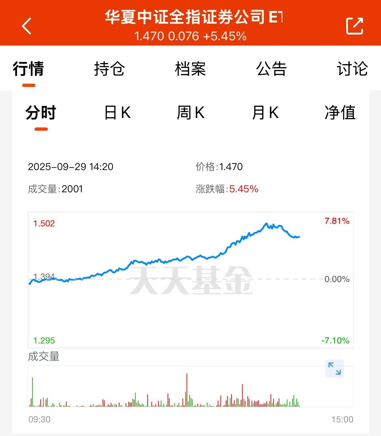 这只$华夏中证全指证券公司ETF联接C$今天冲得猛啊,盲猜今晚至少6个点,这只能