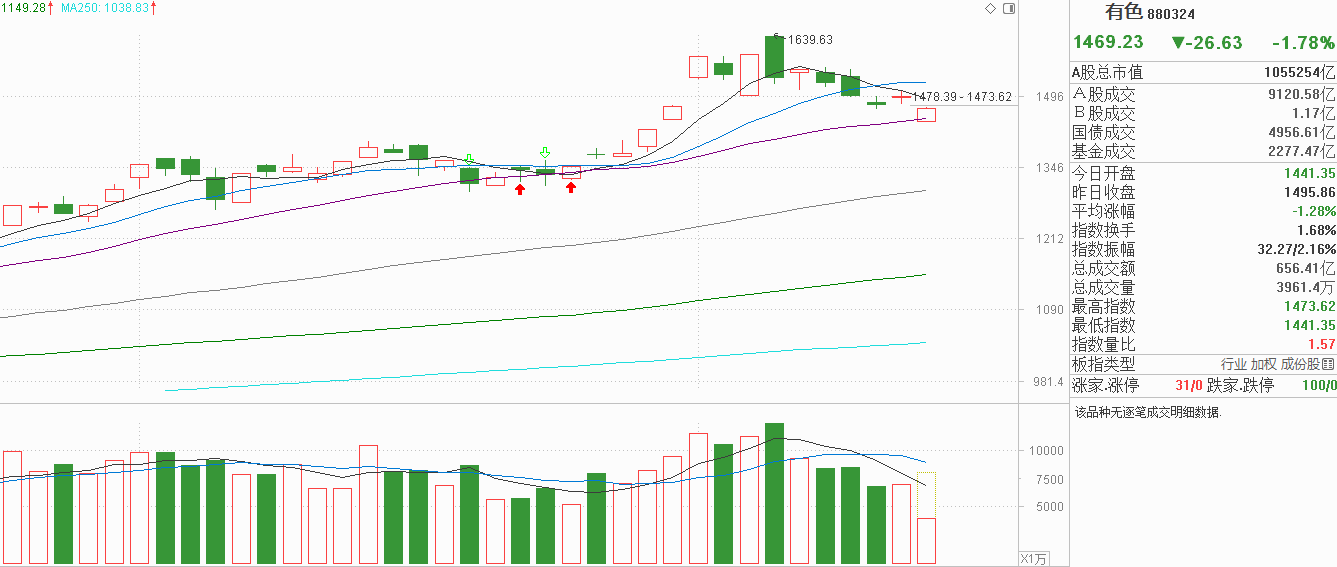 家人们,看看有色金属是啥德行?昨天窄幅震荡,前天也是窄幅震荡,上周五冲高回落小阴调整当时认为只是回补跳空缺口,并没有想过黄金可以一天急跌这么狠。昨天,今天黄金的区间波动接近10%,对有色金属来说无疑是一个利空,毕竟所有大宗商品的定价是有联系的,黄金回落对其它资源品也会有影响。今天有色金属大幅低开在20天线后回升,下跌幅度远低于黄金,但由于先于黄金率先见顶,回调也应该较弱一些。由于目前贵金属价格不确定性较大,有色金属估计还会受影响,假如这一次黄金走弱是确定的,黄金有概率会回到9月平台再寻支撑,我认为这是最坏的情况,如果有色金属可以凭借20天线继续上行,整个上升趋势并没有改变,在有色金属重新站上5天线后,拐点有可能重现能继续看好。