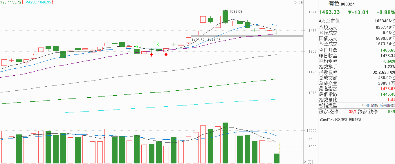 都瞅瞅有色金属啊!昨天因为黄金价格大幅下行出现低开,凭借20天线的支撑重新走高但并没有收涨,也没有收复5天线的压制,实际上是一根假阳线,表示20天线有承接而已。今天5天线继续下行,有色低开后反抽一下5天线就回落了,说明5天线的抛压还是很重。昨天低开高走,今天小阴调整,这节奏怎么看怎么熟,这不就是指数13号与14号的表现吗?今天有色金属回调,就能抄指数的作业,本周甚至下周要出现上涨并容易了,当前市场又是缩量的,有色金属从14号开始也出现持续的回调,从调整空间上看,其实比指数还要深,我觉得没有资金流入的情况下,有色金属下方还有一个很明显的跳空缺口,市场低迷把缺口补了也是有可能的。投资其实是人的游戏,没有人参与且上升趋势也结束了,有色金属得先寻找支撑出现了才能抢反弹,不要一看到均线有支撑就觉得稳了,得看市场整体大环境!
