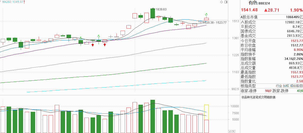 看好有色金属的朋友们,注意了!上周五小阳反弹至10天线,由于10月后有色金属也出现过一阶段的回撤,导致10天线其实是拐头向上的,上周五反抽至10天线,阳线力度并不大,未能确认突破信号,只能依据有色金属在20天线获得支撑,20天线是有色金属的强支撑区域,随着20天线继续上行,对有色金属有推动作用。周末市场偏暖,有色金属今天高开高走中阳反弹,直接把10天线明确踩在脚下,我觉得是一个变盘信号。经过近两周的回调,有色金属短期抛压释放基本完毕,随着降息临近,继续有不少买预期卖现实的资金继续押注涨价题材,有色金属作为大宗商品的主要受益板块,这种推动是有效的。随着20天线企稳后连续四天上行并突破阻力,资金二次进场的信号明确,我认为继续创10月甚至全年新高都是有可能的。