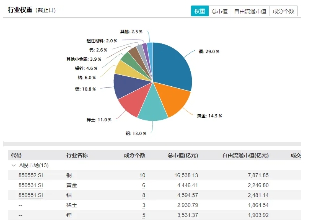 其跟踪的中证申万有色金属指数,由沪深两市中日均总市值前50的有色金属行业公司组成。指数重点覆盖工业金属,同时包含黄金、稀土、锂等多个细分领域,权重分配相对合理,兼具代表性和弹性:既包含了具有金融属性的黄金等贵金属,为投资组合提供避险功能;也涵盖了工业金属如铜、铝、锌,这些是经济发展的基石;同时还布局了稀土、锂、钴等战略金属