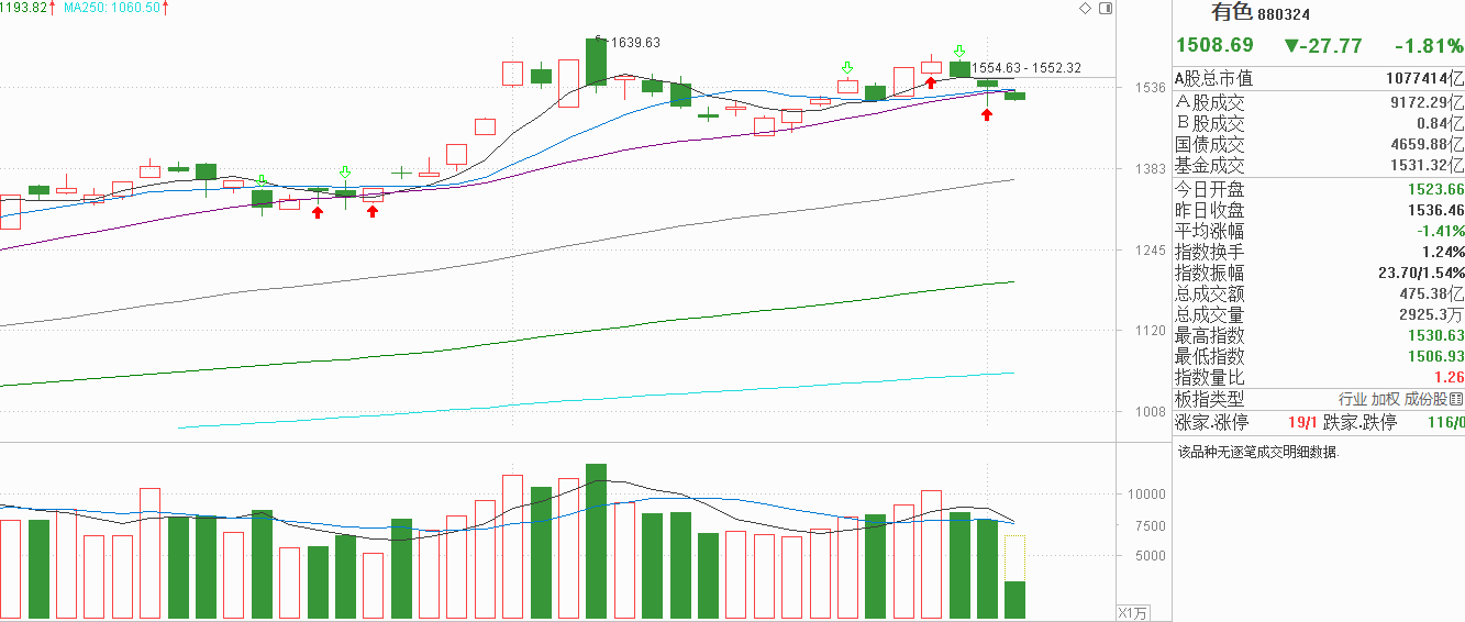 老铁们,各位关注有色金属的朋友,你们是不是都被吓得不轻? 低开低走一度中阴下行击穿20天线,由于10月份的调整20天线是有色金属最明确的支撑,这一次击穿后代表做多动力在下降,20天线再也不是一个观察区域,如果有色金属依旧是震荡,震荡的箱底只能回溯至9月12日的高点,与现在还有不少的空间,如果有色金属无法出现更多的资金流入,下行风险就会加大了。今天有色金属并没有因为昨天探底回升的下影线重新站在20天线上方,而是在20天线下方窄幅震荡,代表资金并没有选择流入,震荡行情下有色现在失守5天线、10天线和20天线,滞涨信号较为明显,无法走强就要回到箱底再观察市场动态可能好一些。当然,如果有色金属今天能以中阳反弹收复近两天的回调,向上突破的希望还是存在的,现在就是一个临界点,向上还有机会,向下就要注意风险了。