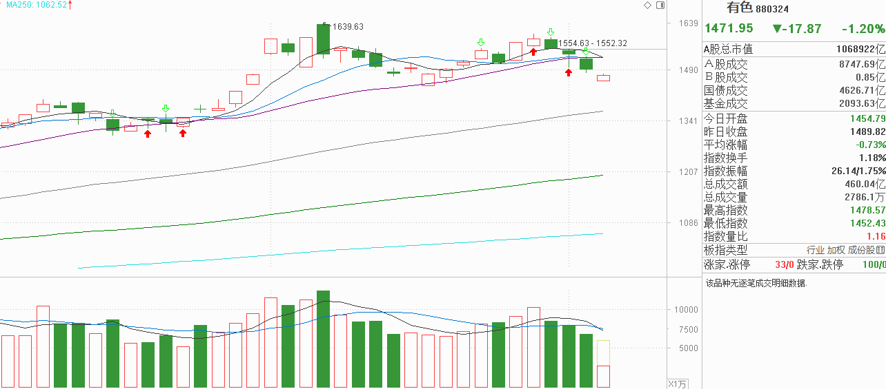 各位有色金属的粉丝朋友们,你们看看昨天是啥表现!低开低走中阴调整,把周一的下影线低点击穿,明确失守20天线。20天线作为10月有色金属的强支撑破位,意味着有色金属向上突破失败,短期获利盘有兑现需求。今天有色金属再度跳空低开后走高,位置与10月22号相近,我认为是连续下行三天的一次技术反抽,上一次有20天线做支撑,这次没有均线支撑,不能直接类比这个位置可以企稳。有色金属上方阻力越来越大,而市场成交量是越来越少,我认为向上突破的条件不足,既然支撑已失守,就看大箱体。当前有色金属的支撑区域,也许就是9月的震荡平台,在走势上看是60天线的位置所在,离当下还有一段距离。当然有色金属也不可能单边下行一步到位,抵抗式回落至60天线出清短线止盈盘再看有没有机会也是可以的,没必要在刚刚破位时就急于看好。