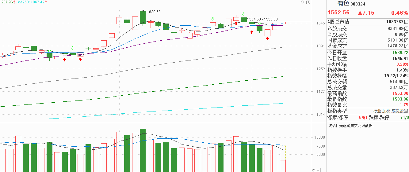 有色金属的朋友们,昨天你们是不是看到了一丝曙光?小阳反弹收复20天线,与周三低开高走小阳线形成连续两天反弹而且明确探找出短期支撑依然是10月17号的低点,这就形成有色金属特有的高位震荡行情,低点、高点都很清晰。当前运行在箱底至箱顶的短周期上涨行情。今天海外市场再次走弱,有色金属仅微幅低开后就震荡走高,比起周三的抛压看来是更少了,目前离10月13号、10月30号的双高点还有一点距离,如果还是箱体内波动,有色金属还有上涨的空间,但要完成突破,光靠目前的成交量与上涨力度是不够的。但未来的事谁说得准?先按箱体震荡未达到箱顶看待,即有色金属还有上涨的潜力,但追涨就没有必要了,真要追涨,得确认有色金属出现明确的向上突破信号,这信号现在未出现,只能一连看涨,一边观望。