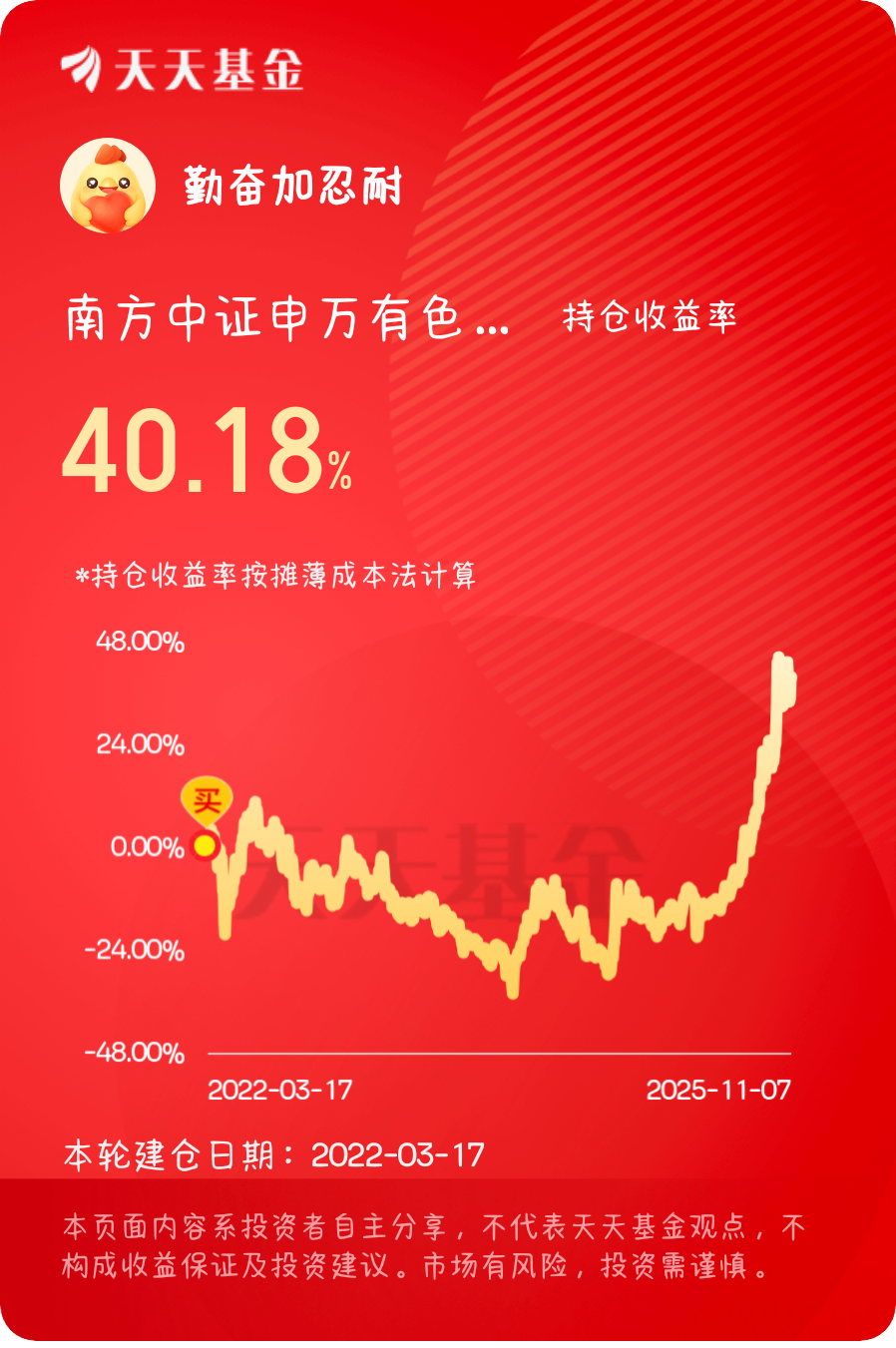 现在已经要4连涨的节奏了,踩得不错,继续看好。$南方中证申万有色金属ETF发起联接C$ #晒收益#