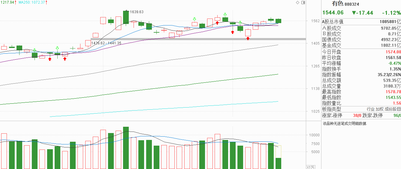 有色金属的朋友们,注意了!昨天高开后震荡走低,虽然是上涨的实际上表现为假阴线,有色金属现在的位置是10月9号、13号和30号的高点附近,如果有色金属无法形成突破行情,这里就是一个比较大的箱顶阻力区,昨天高开低走代表抛压比较大。今天有色金属又是高开后走低回踩5天线,连续两天走低当然是走弱的表现,可有色金属的市场重心还在5天线之上,这就比较尴尬了,他不击穿5天线、20天线,也不能说承接力不强,假如尾盘回升或明后天继续中阳反弹上行,当前就是突破前的主动减压,在逻辑上是说得过去的。我会这样安排:如果有色金属能中阳反弹向上突破前高,继续跟随主力看涨是必须的,因为突破了上方空间打开了;如果有色金属无法向上突破,回调时也失守了5-10天线甚至是20天线,这就是箱顶位置,逢高止盈等待下一次确认支撑区域再看好。