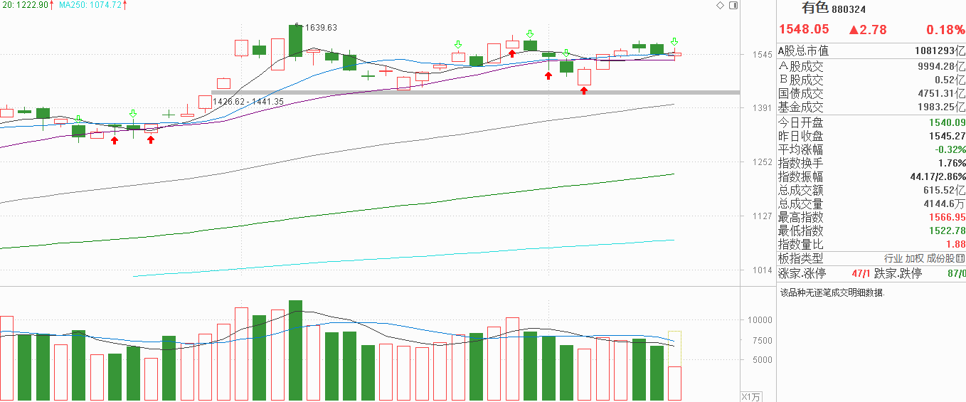 有色金属板块的朋友们,都给我听好了!昨天小阴调整回踩5天线,当时认为均线是一个临界点,守住还有希望向上突破,守不住就是大箱体震荡的箱顶。今天有色金属低开看来是守不住5天线,向下回落至20天线又回升,下影线虽然比较短,但5天线并未明确失守,特别是现在的行情变化很大,尾盘很容易产生逆方向的量化对冲,我还是原来的观点,5天线是临界点,如果刚好站在5天线,那就继续观望。有色金属虽然10月上涨后产生一个多月的震荡,与医药8月后出现横盘有点像,只要资金转弱,基于医药的走势就不用再等下方支撑或箱底潜伏,破了5天线就跑,可是主力就在5天线附近震荡,你也拿他没办法。